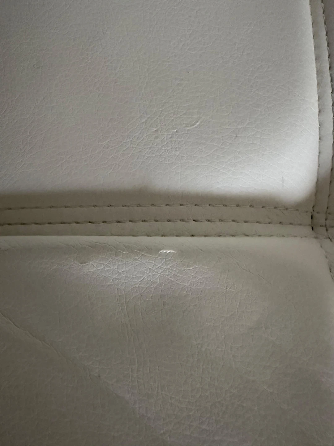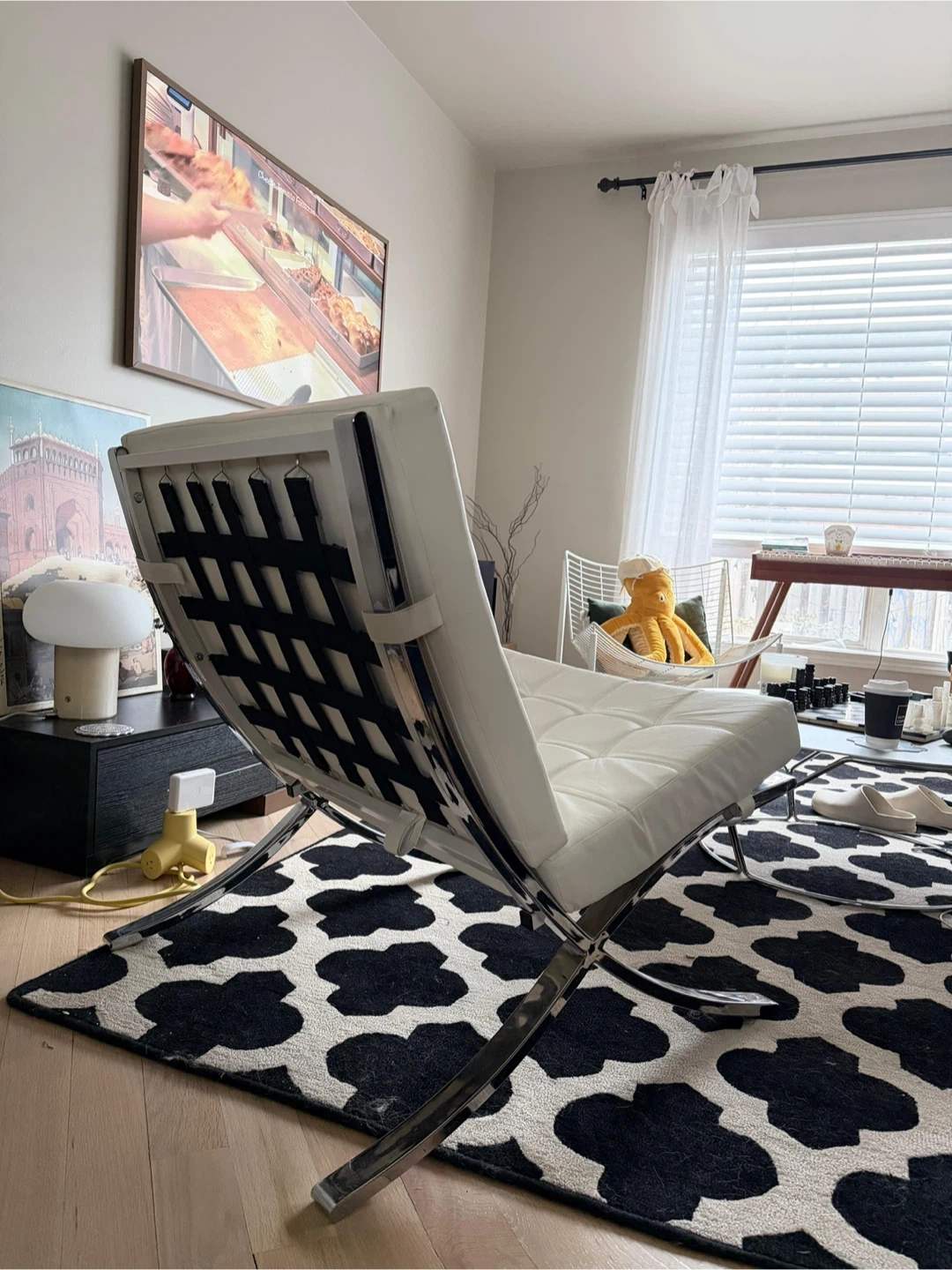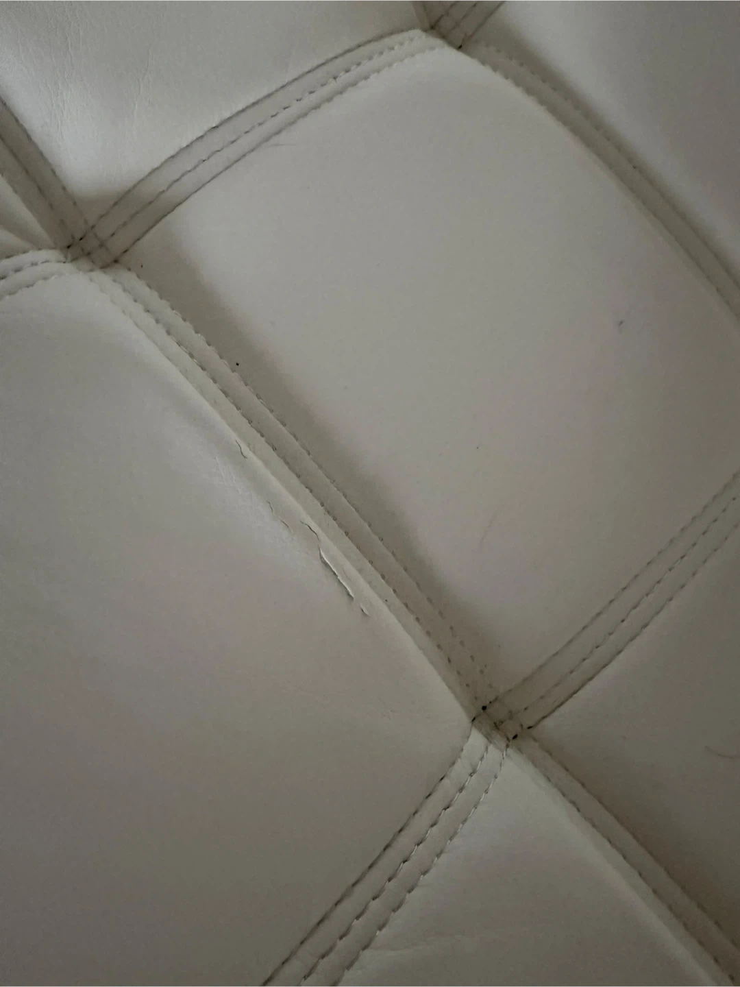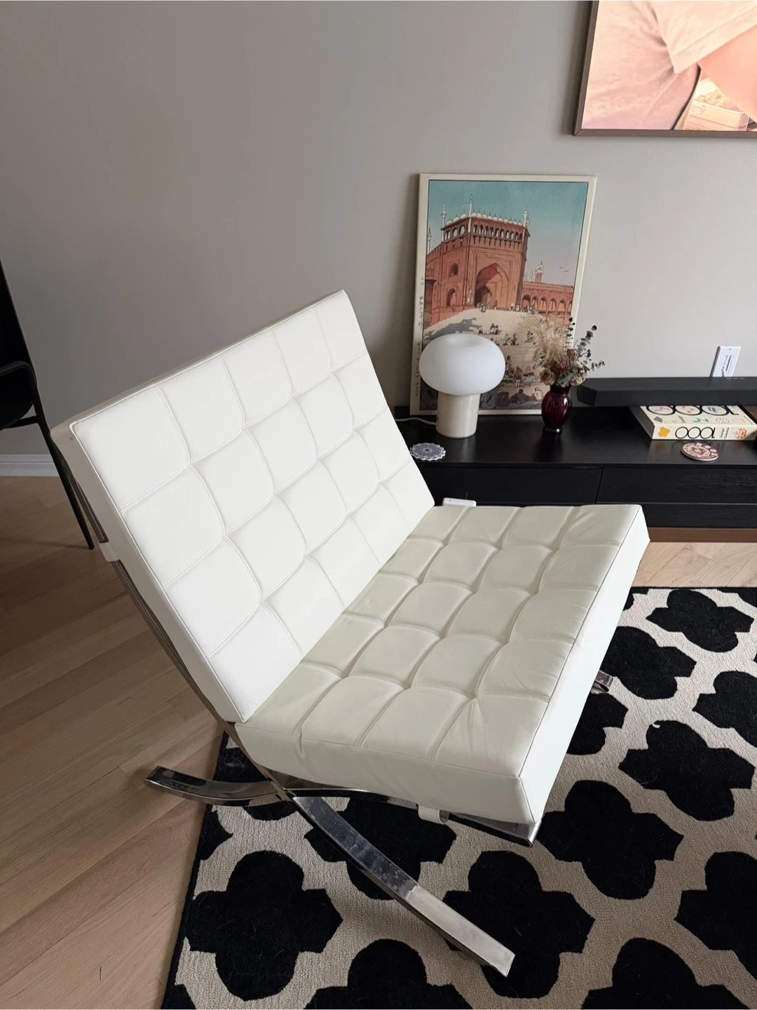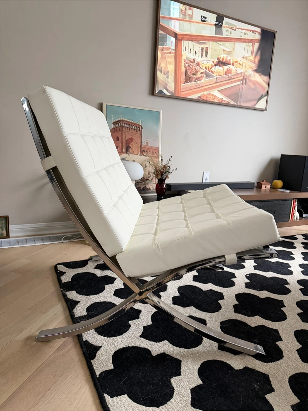 Selling a Barcelona style chair with a white leather seat and a chrome frame. It's a stylish piece that would look great in any modern living room or office. There are some minor signs of wear on the leather, as shown in the photos, but overall it's in great condition