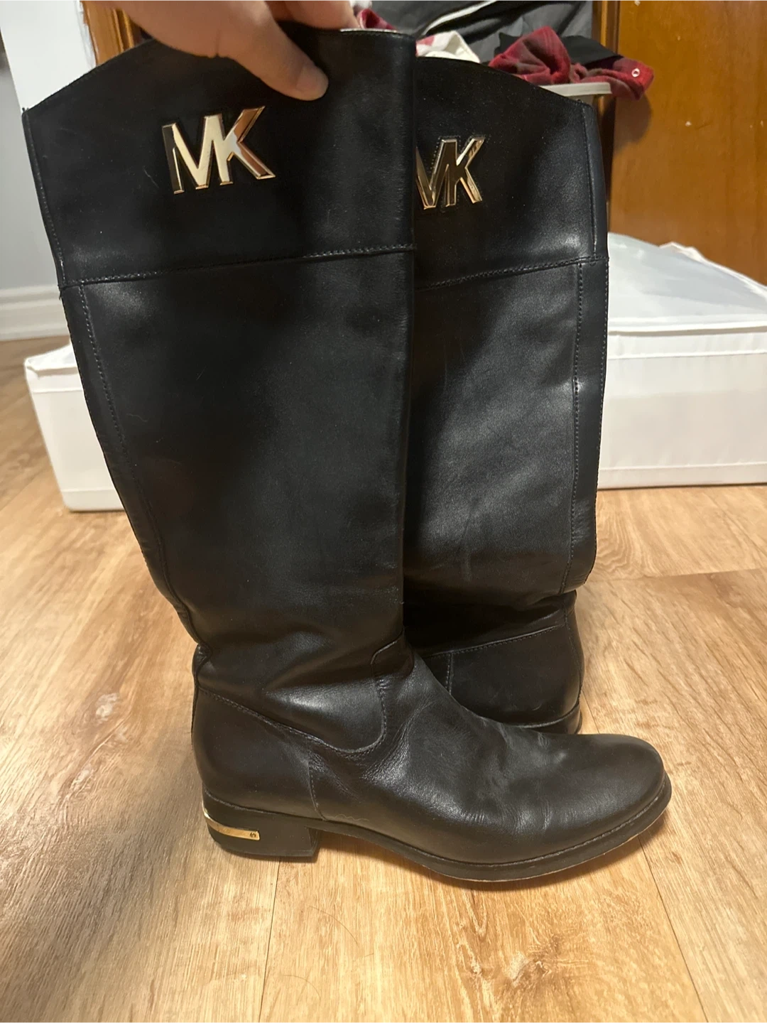 Selling a pair of Michael Kors riding boots in black leather. They feature the MK logo at the top and a small heel. These boots are perfect for fall and winter!
