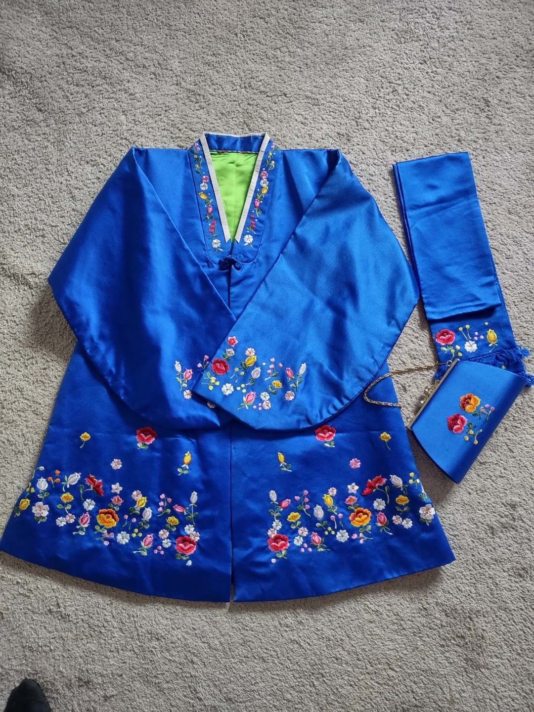 Beautiful blue Hanbok with delicate floral embroidery! Comes with the 한복위에 입는 코트 분위기 두루마기 and a matching purse. Perfect for special occasions or cultural events