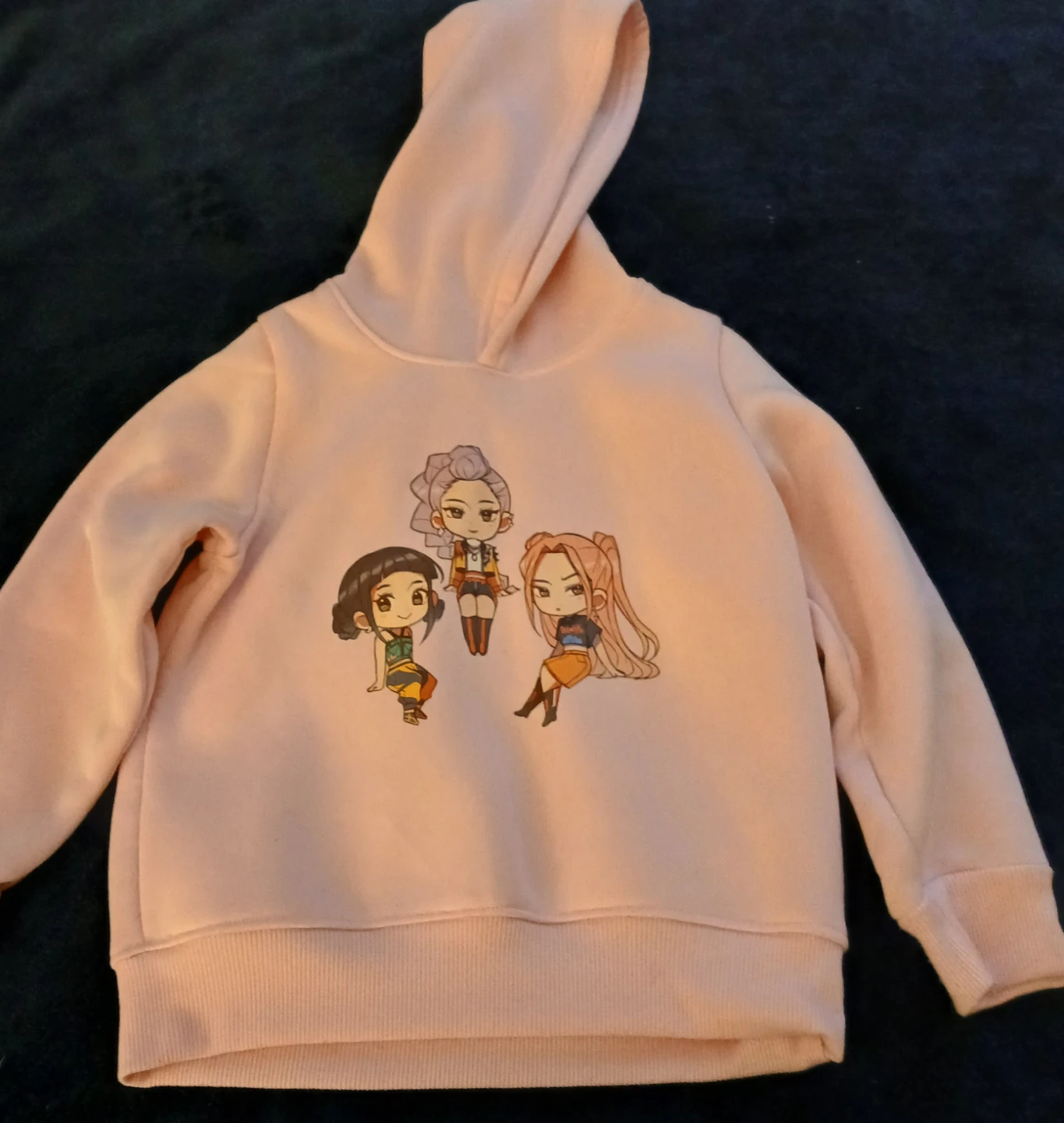 Selling a cute pink hoodie with K Pop Demon Hunters design for 5 year old.