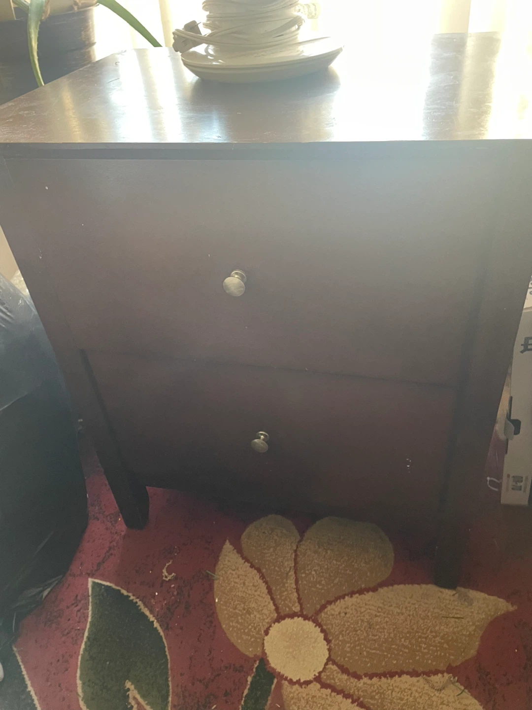 Selling a brown wooden nightstand with two drawers. Great for bedside storage or as a small side table in any room