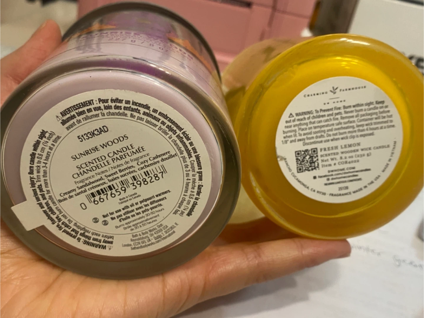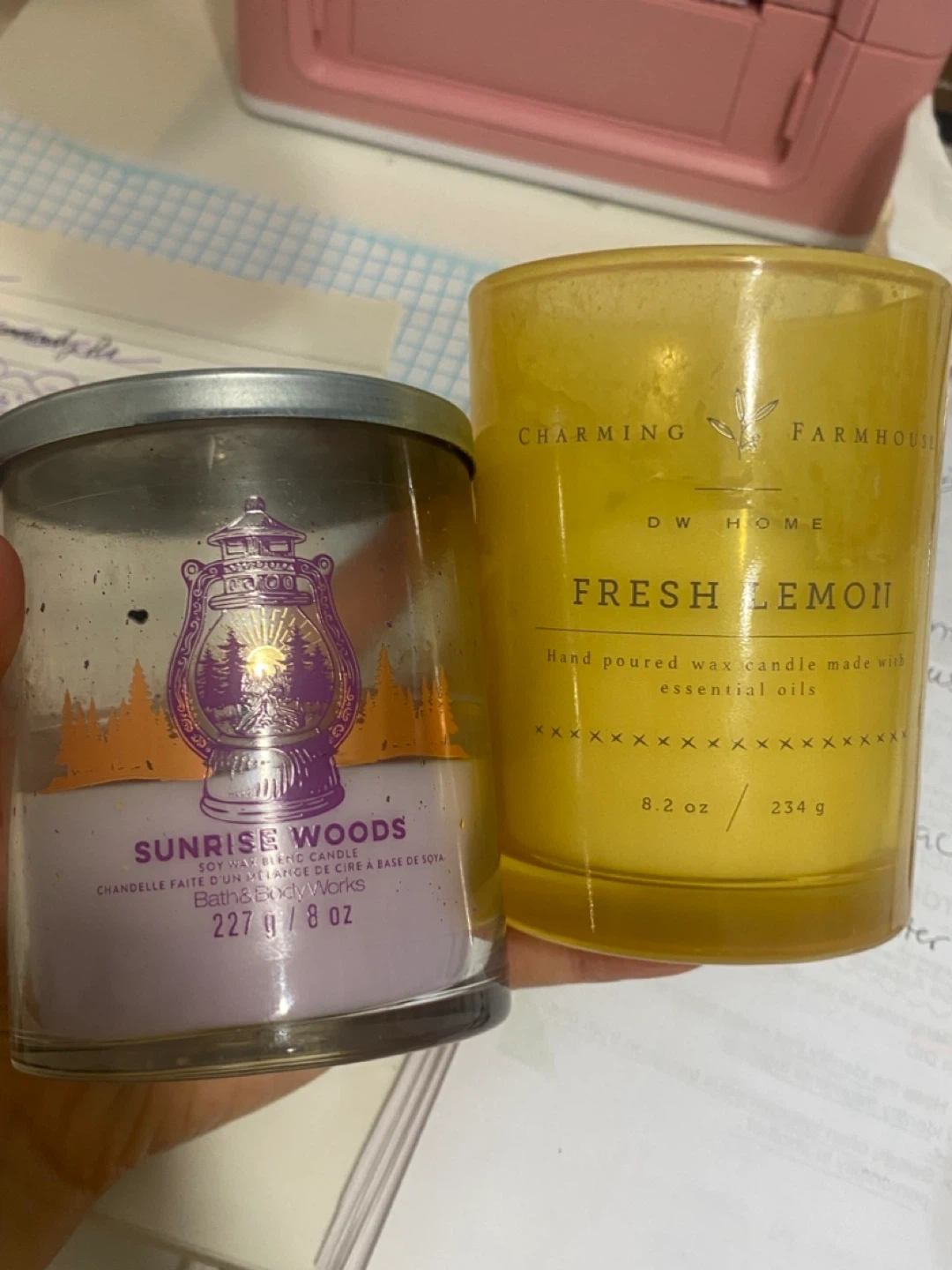 Giving away two scented candles: a Bath & Body Works Sunrise Woods candle and a DW Home Fresh Lemon candle. The Sunrise Woods candle has fragrance notes of sweet berries and cozy cashmere, while the Fresh Lemon candle is made with lemon and other essential oils. Both are used