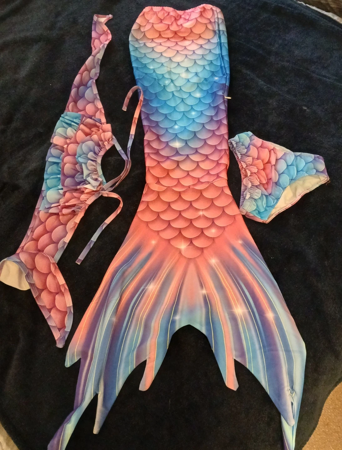 Cute mermaid tail swimsuit set with a colourful scale pattern! Perfect for dress-up or swimming. Includes the tail, top, and bottoms.