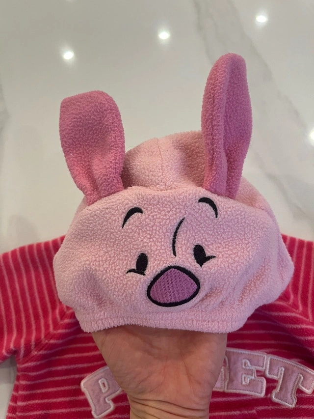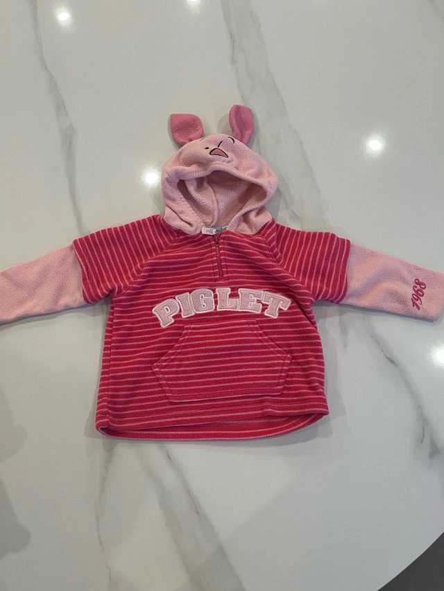 Keep your little one cozy with this adorable Disney Piglet hoodie, sized 24M. This pre-owned hoodie features a cute Piglet design on the hood and a striped body. It's in good condition and ready for a new home. It's just waiting for a loving home to snuggle up in.