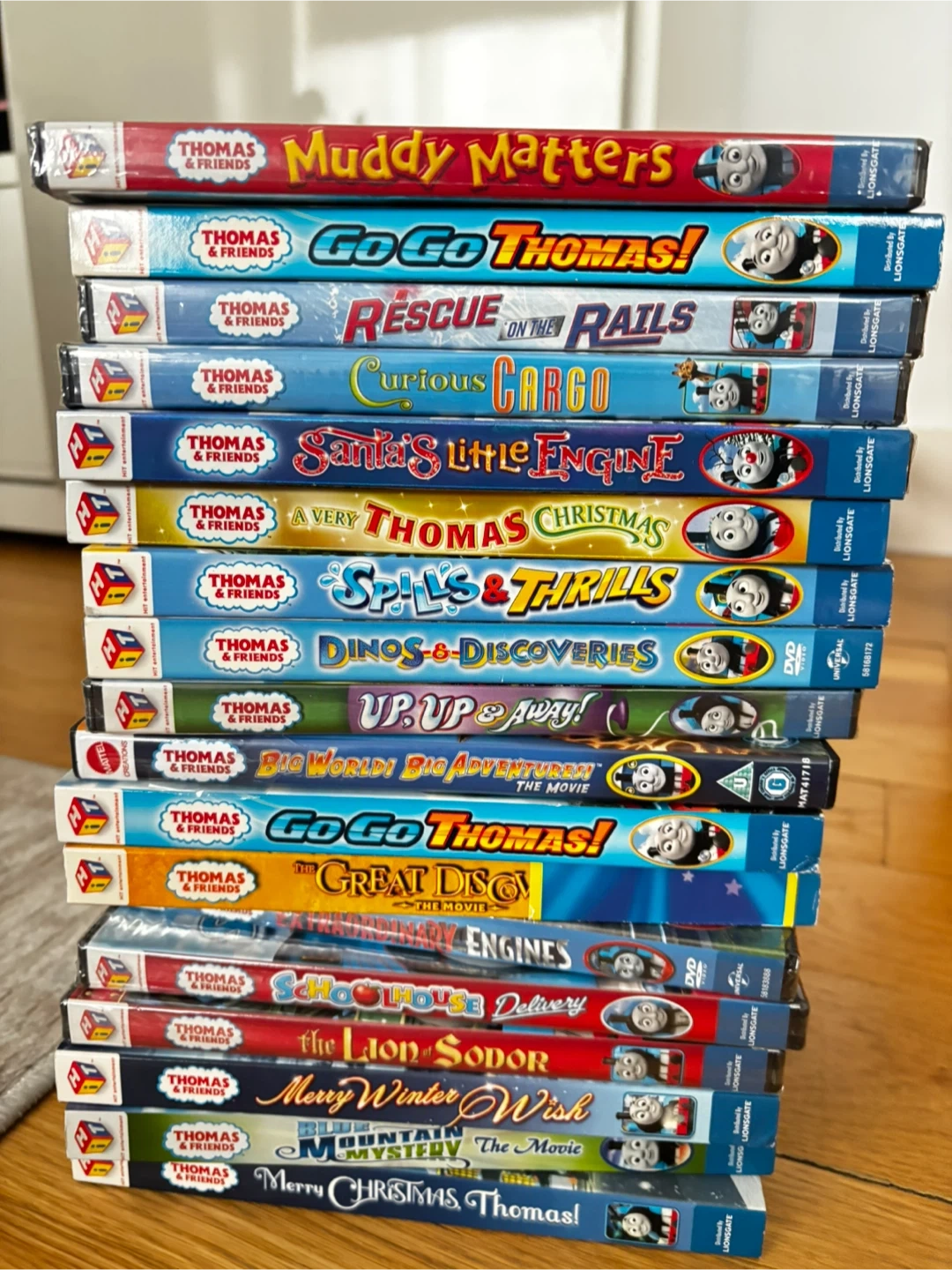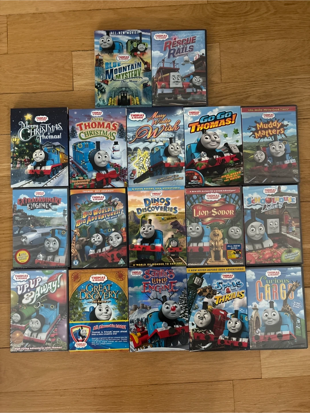 Selling a collection (17)of Thomas & Friends DVDs! Some are new! Titles include Muddy Matters, Go Go Thomas!, Rescue on the Rails, Curious Cargo, Santa's Little Engine, A Very Thomas Christmas, Spills & Thrills, Dinos & Discoveries, Up Up & Away!, Big World! Big Adventures!, The Great Discovery, Schoolhouse Delivery, The Lion of Sodor, Merry Winter Wish, Blue Mountain Mystery, and Merry Christmas Thomas!
