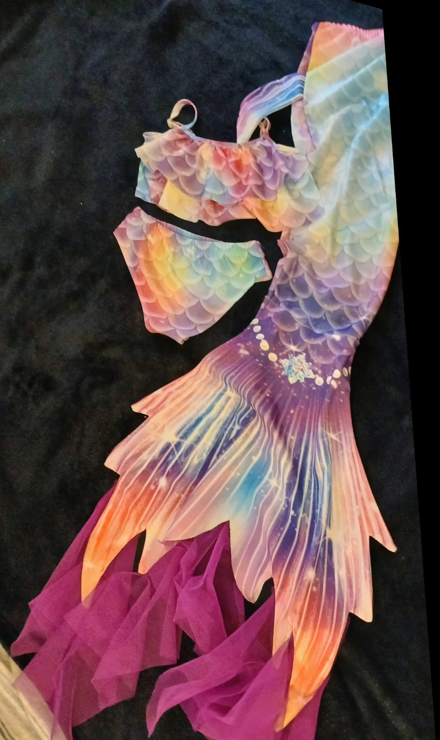 This is a cute rainbow mermaid tail swimsuit set! It includes the top, bottoms, and tail. Perfect for a fun day at the pool or beach.