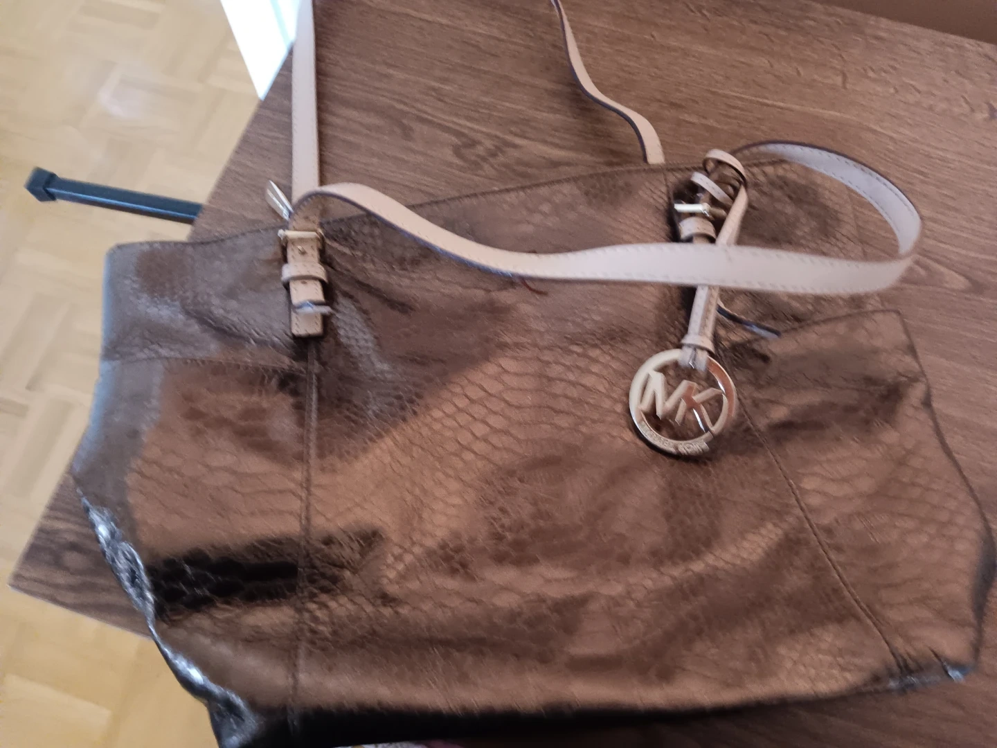 Selling a Michael Kors tote bag! It's in great shape and ready for a new owner. The bag features the classic MK logo in a bronze colour and a stylish design. Perfect for carrying your essentials around town! It can also be used as a laptop school bag. CASH offer only.