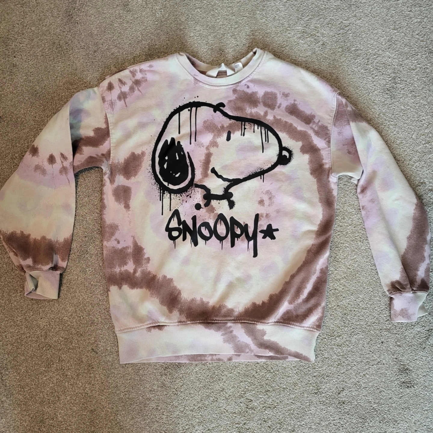 Here's a cute tie-dye sweatshirt from H&M featuring Snoopy! It's in great condition and ready for a new owner. Perfect for adding a touch of fun to your casual outfits