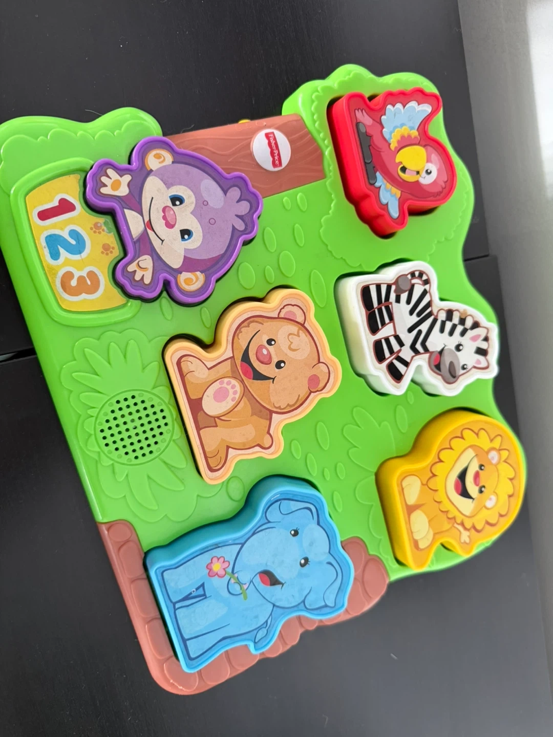 This is a Fisher-Price animal puzzle for toddlers. It features colourful animal shapes that fit into a green base. Great for developing fine motor skills and animal recognition
