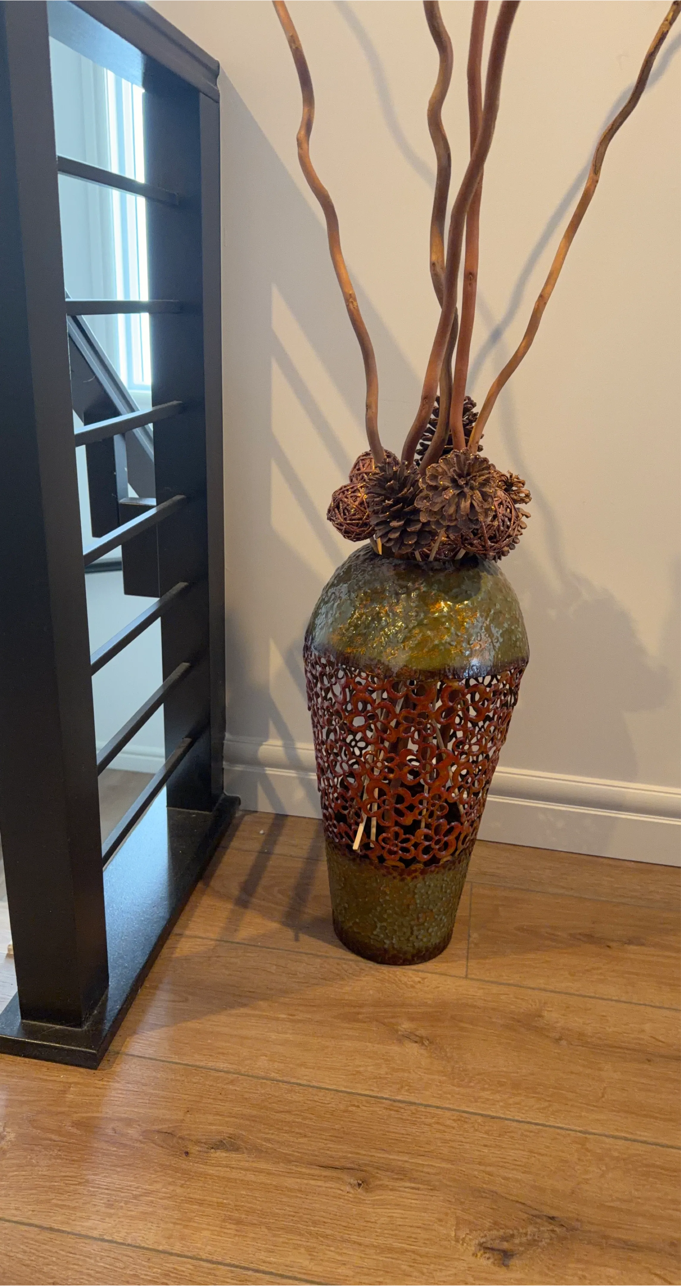 A unique decorative vase with an earthy, textured finish. It comes with a set of decorative branches and pinecones, perfect for adding a natural touch to your home decor. The vase features an intricate cutout design that adds visual interest and complements the overall aesthetic. It's in great condition and ready to enhance any room!