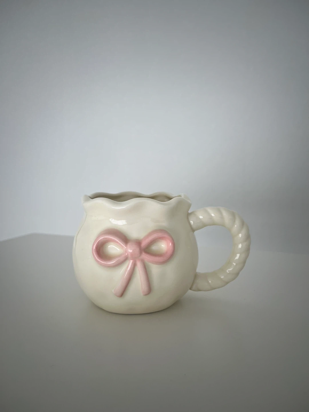 Selling a cute ceramic mug! It's a cream colour with a sweet pink bow detail. The handle has a lovely twisted rope design. Perfect for your morning coffee or tea!
