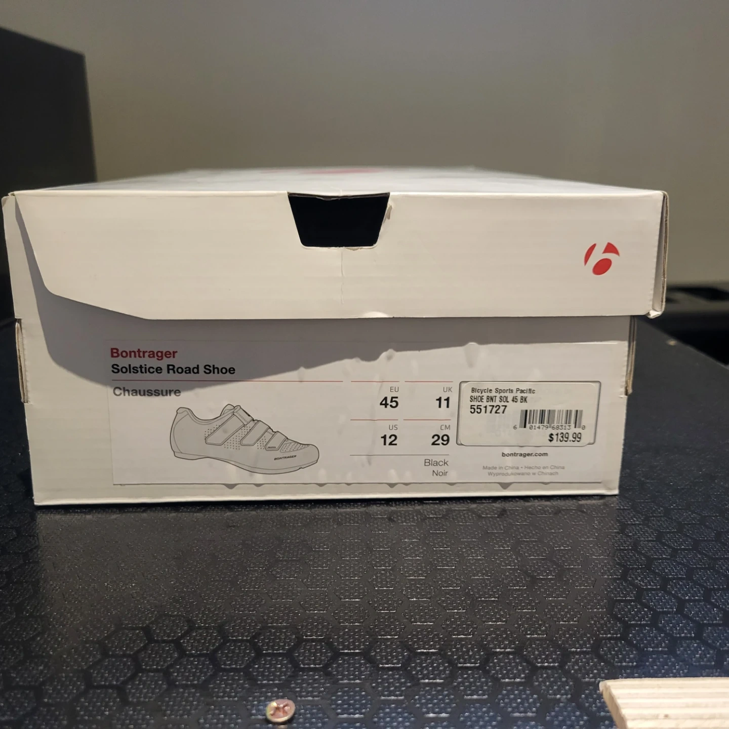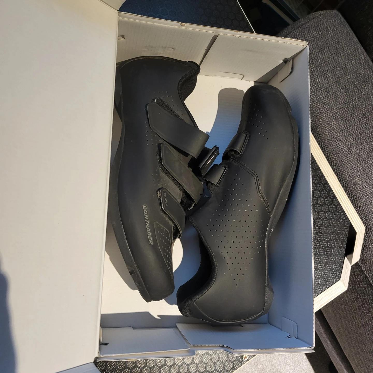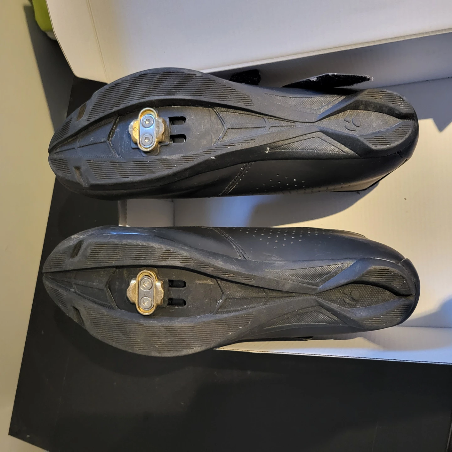 Selling a pair of Bontrager Solstice road shoes in size 12 US. They are black and come with the original box. Retails for $139.99 alone. Includes 2 bolt clips as pictured.
