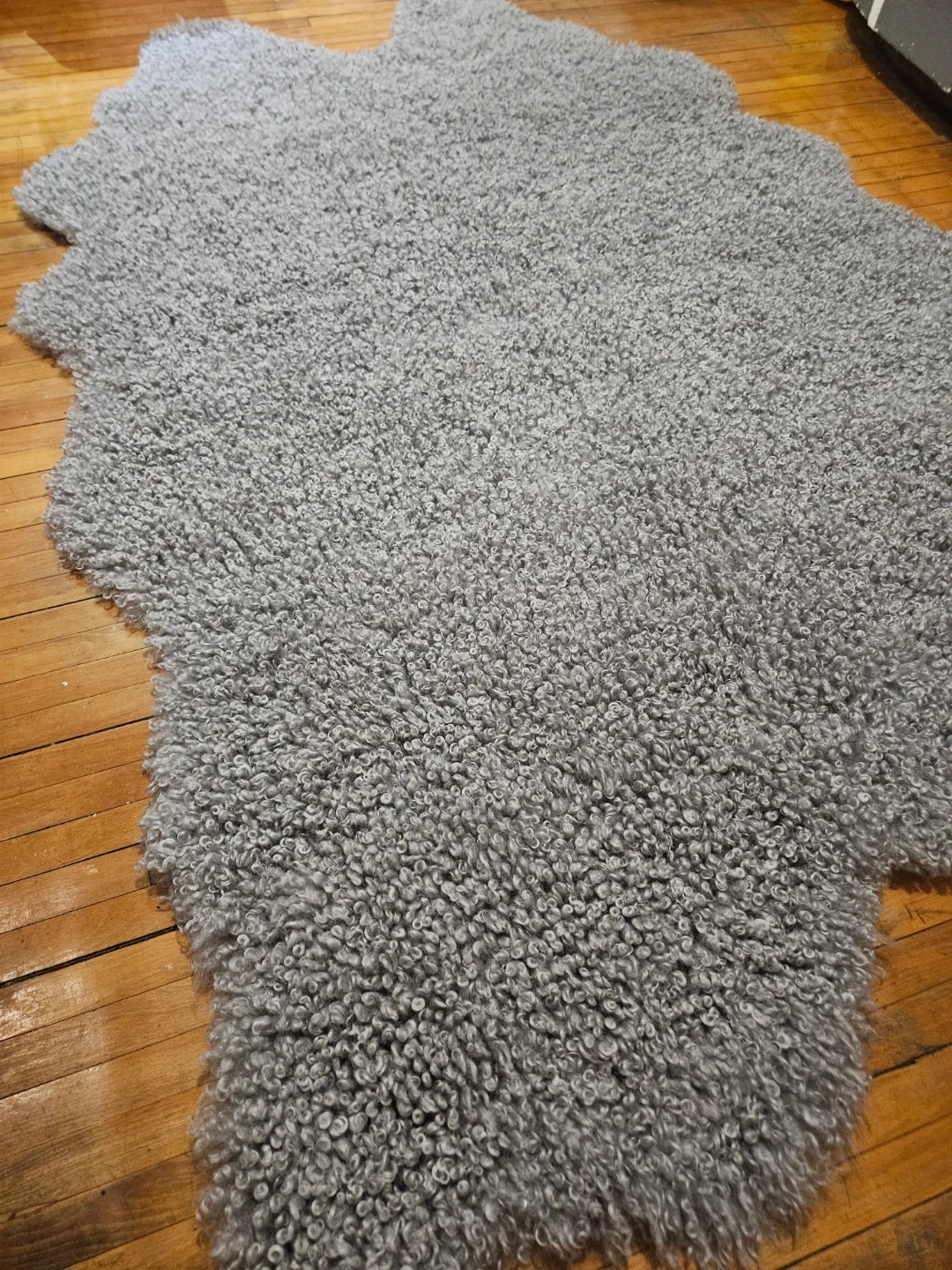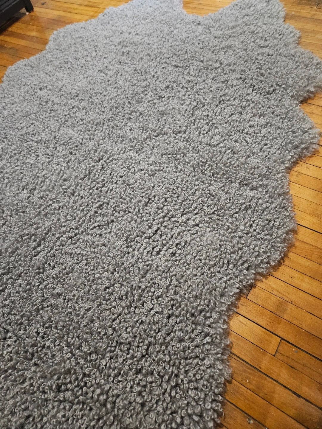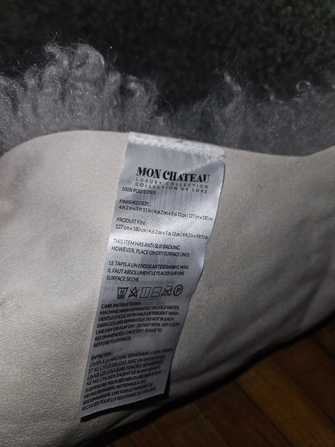 Selling a Mon Chateau faux sheepskin rug in grey. It measures 4 ft 2 in x 5 ft 11 in (127 cm x 180 cm) and is made of 100% polyester. It also has anti-slip backing