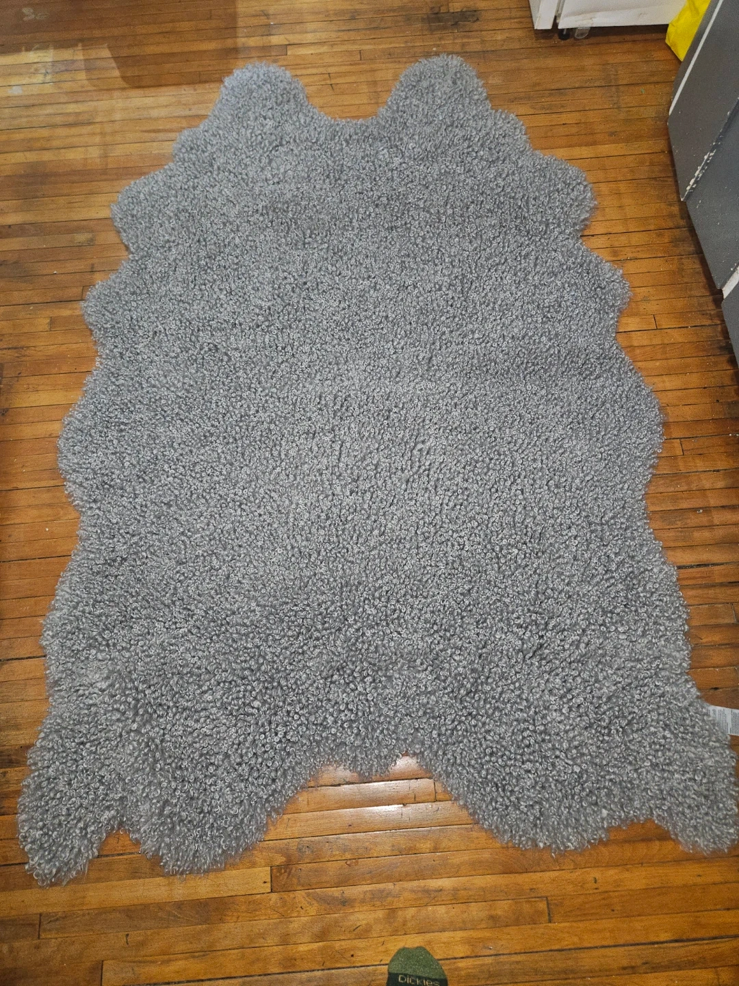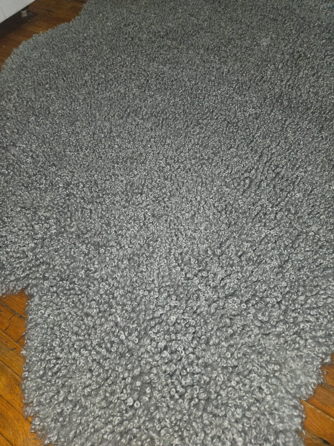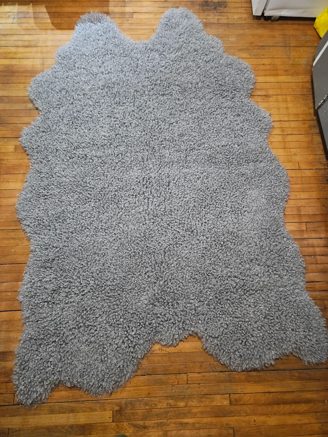 Selling a Mon Chateau faux sheepskin rug in grey. It measures 4 ft 2 in x 5 ft 11 in (127 cm x 180 cm) and is made of 100% polyester. It also has anti-slip backing