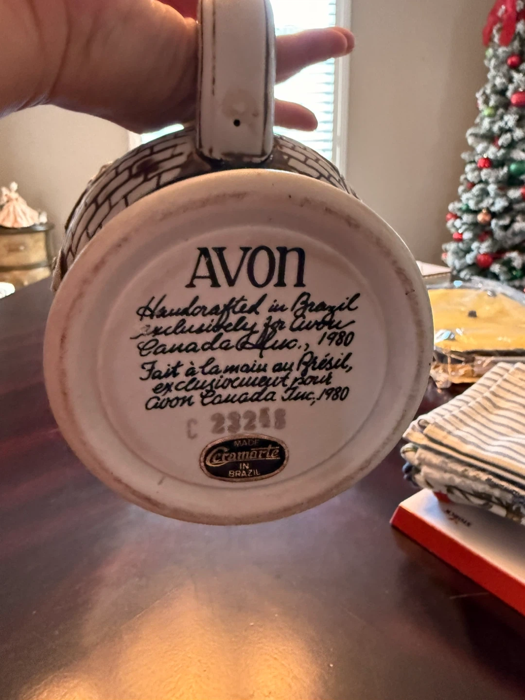 Selling an Avon beer stein featuring a Stanley Steamer 1936 design. The bottom indicates it's handcrafted in Brazil exclusively for Avon Canada Inc, 1980. A unique piece for collectors!