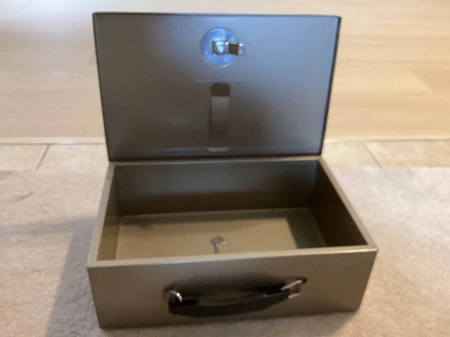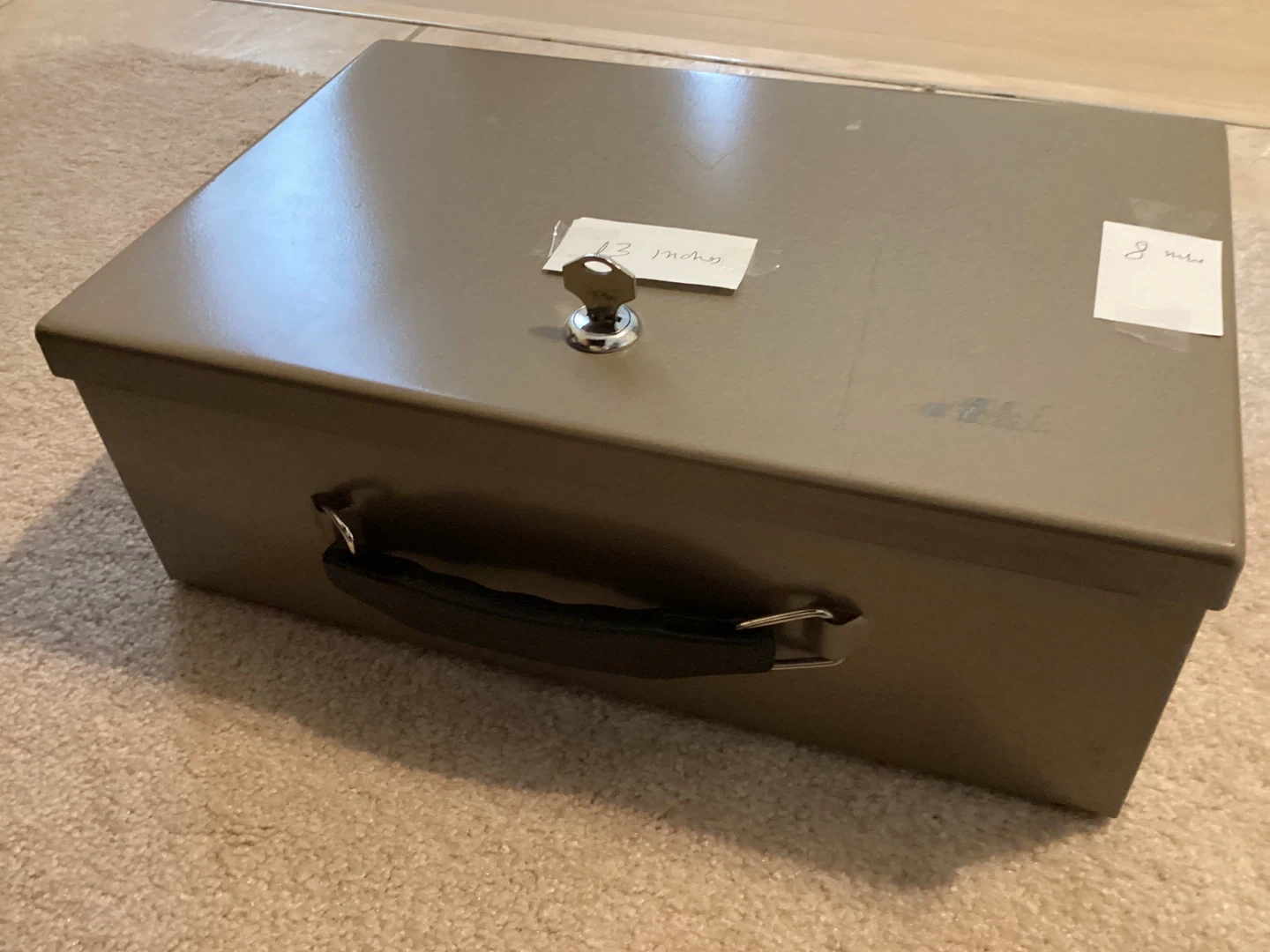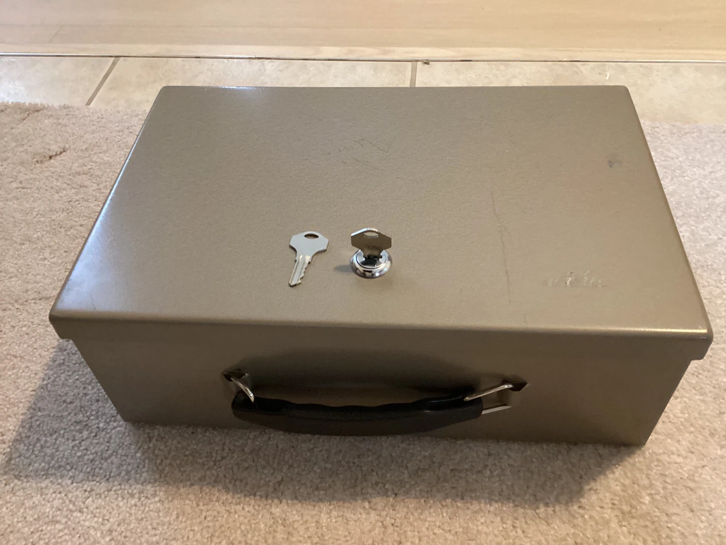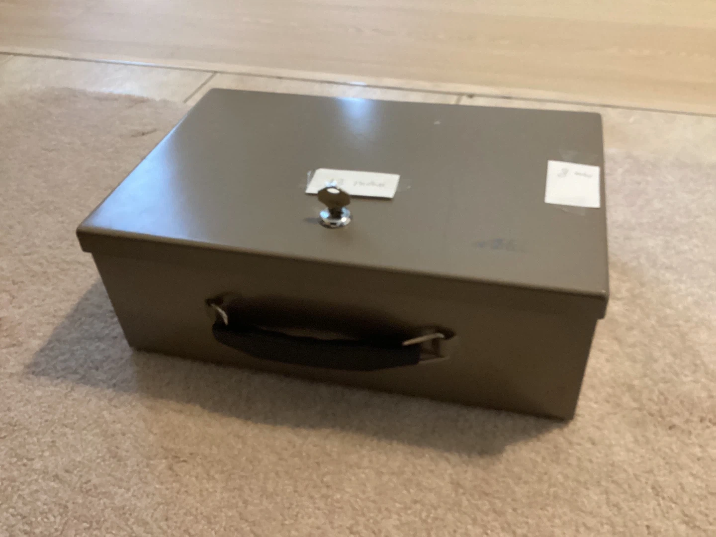 Selling a fire proof metal box. It comes with two keys and has a handle for easy carrying. It's in good condition and perfect for storing valuables or cash.