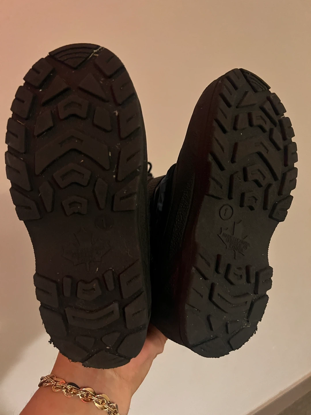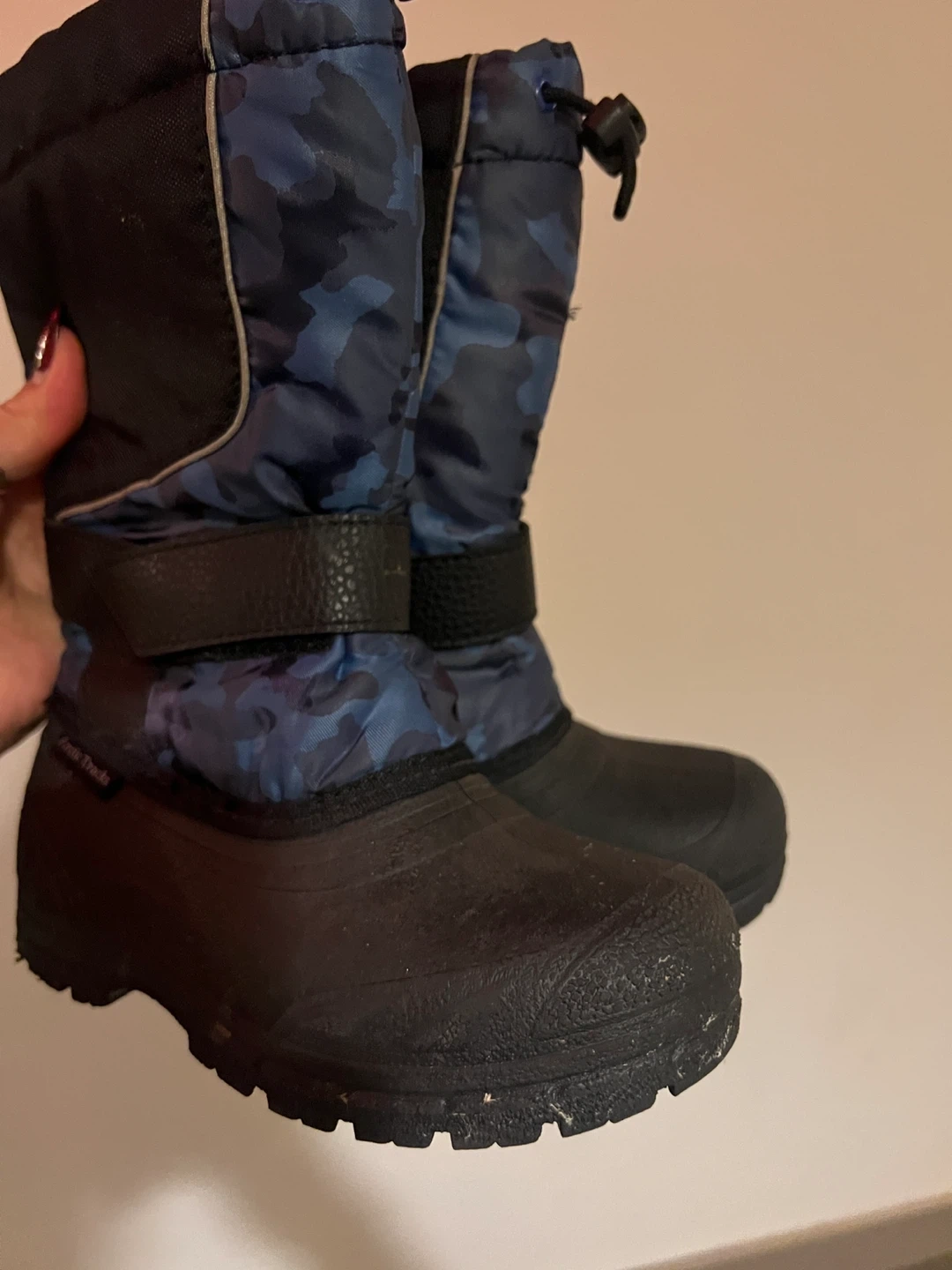 Selling a pair of kids' Tundra boots in size 1. They feature a black base with a blue camouflage pattern on the upper part of the boot. Great for keeping little feet warm and dry during the winter months!