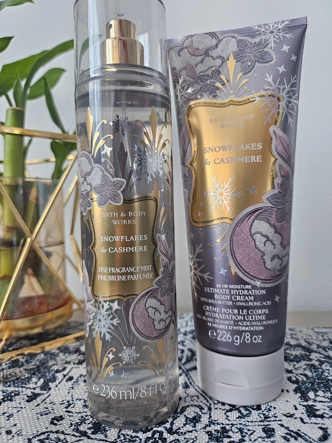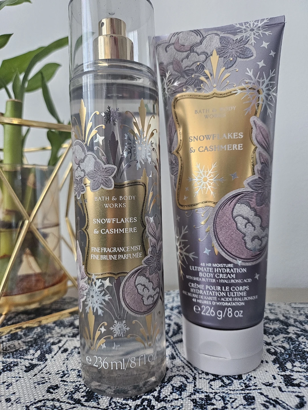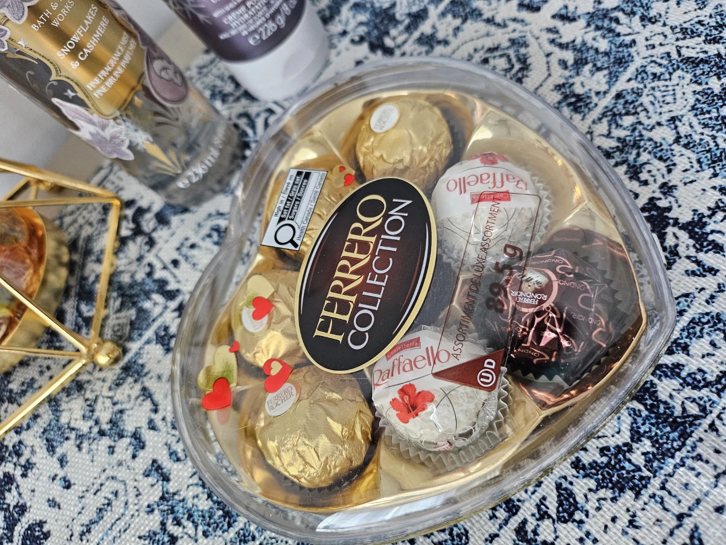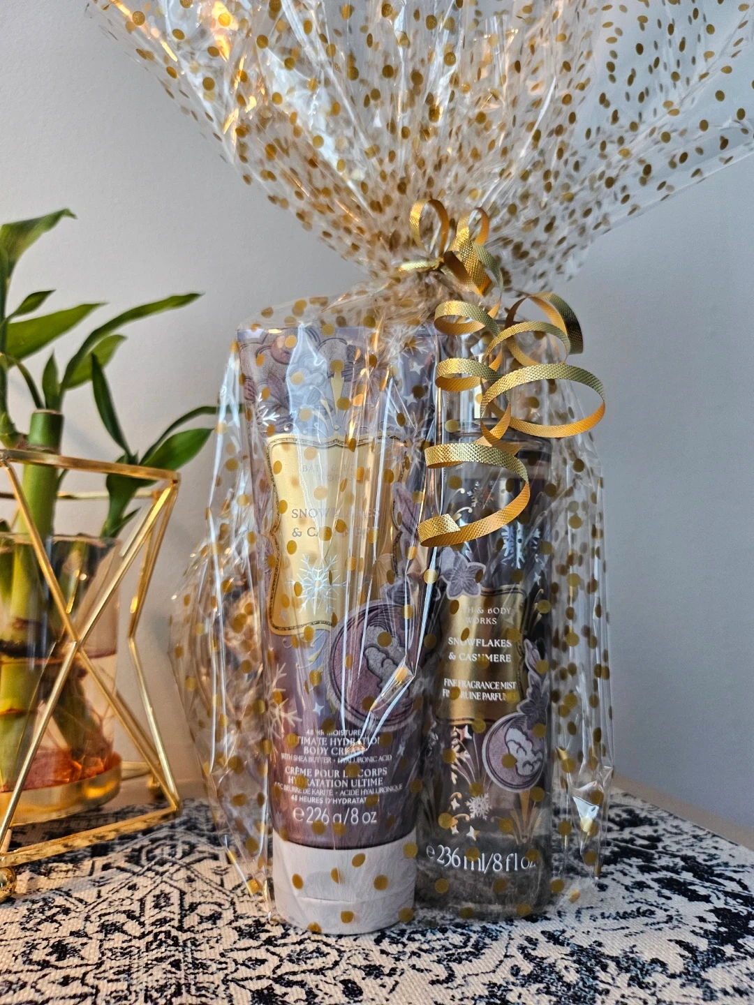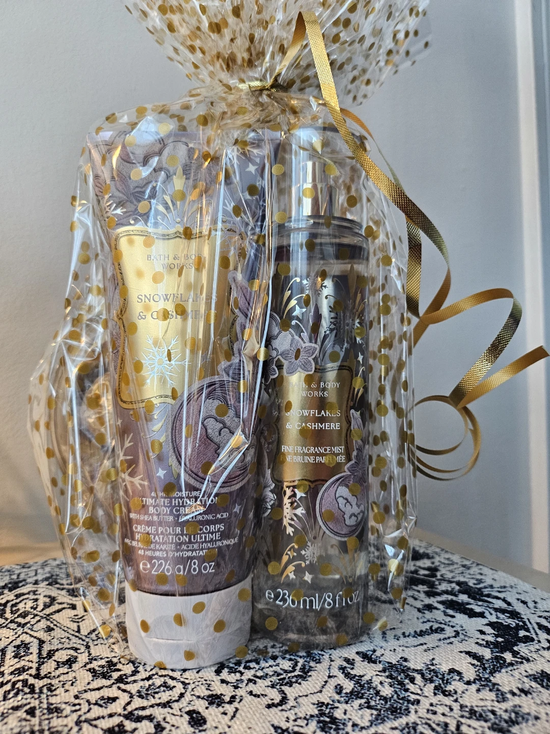 Includes a Bath and Body Works Snowflake amd Cashmere fragrance mist and body cream with a heart shaped Ferrero Rocher chocolate box. Perfect for gifting to someone special!