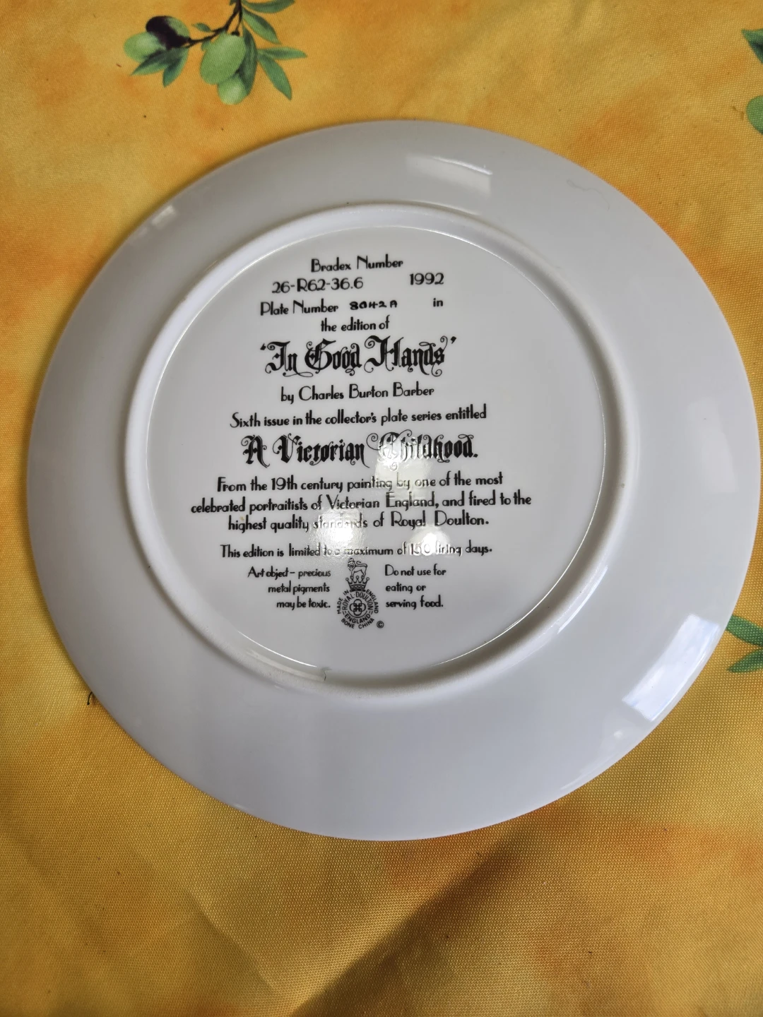 Selling a Royal Doulton collector's plate titled 'In Good Hands' by Charles Burton Barber. It's the sixth issue in the collector's plate series entitled 'A Victorian Childhood'. The plate is from the 19th century painting by one of the most celebrated portraitists of Victorian England, and fired to the highest quality standards of Royal Doulton. This edition is limited to a maximum of 150 firing days. Plate Number is 26-R62-36.6. Plate was made in 1992