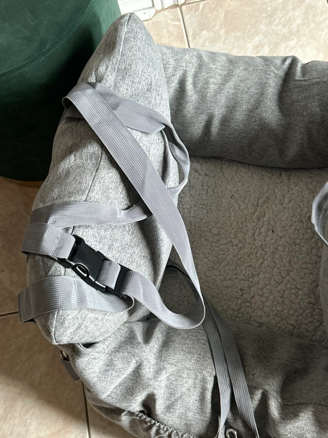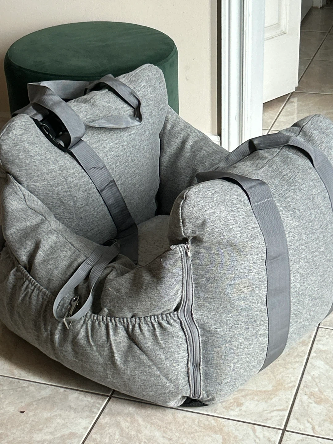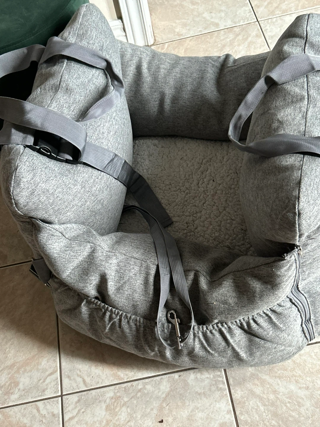 Selling a gently used dog booster seat! It's in great condition and ready for your furry friend's next road trip. The seat is a stylish grey colour and is made of a soft, comfy material. It features straps to keep your dog secure and comfortable during car rides