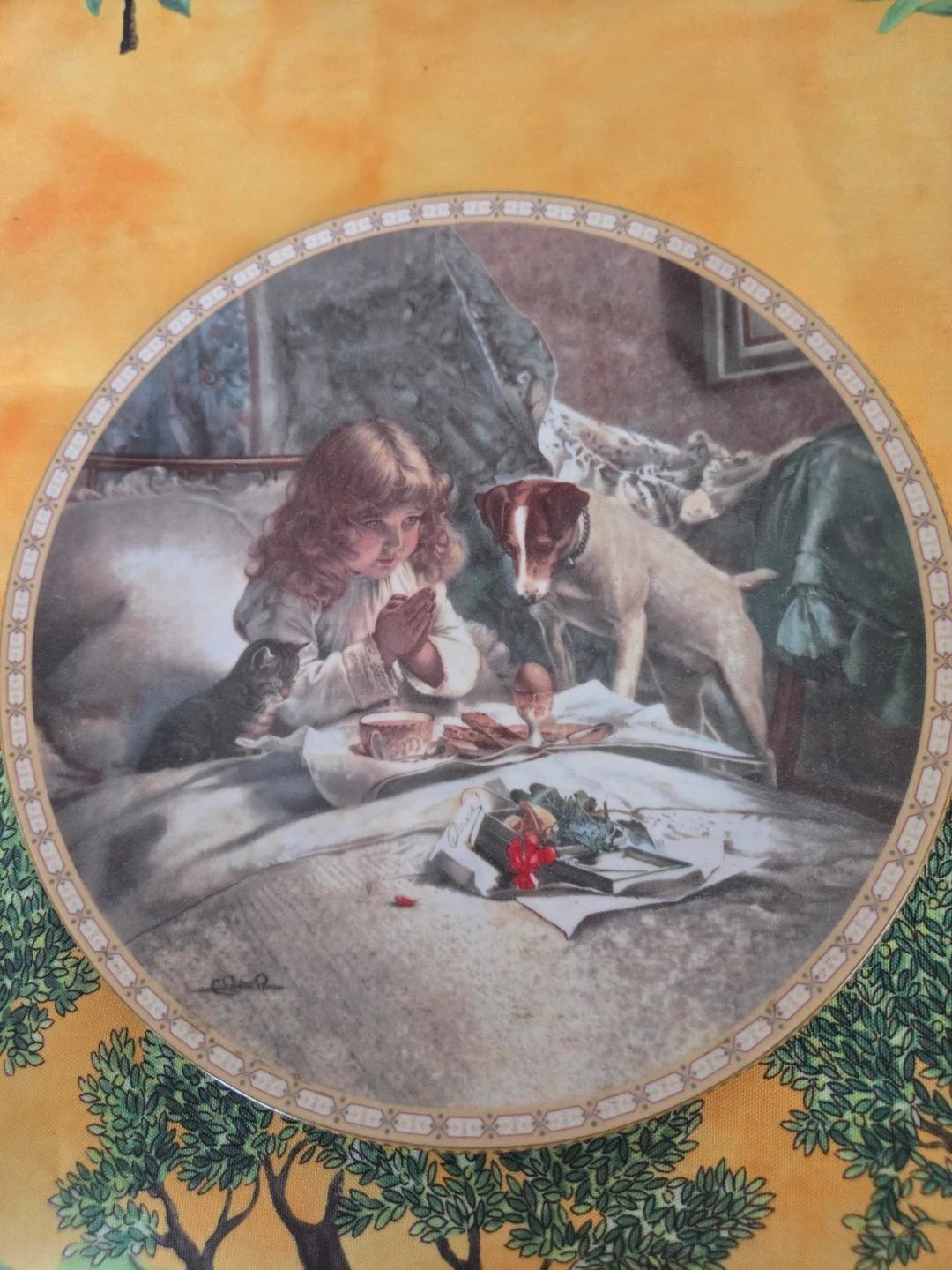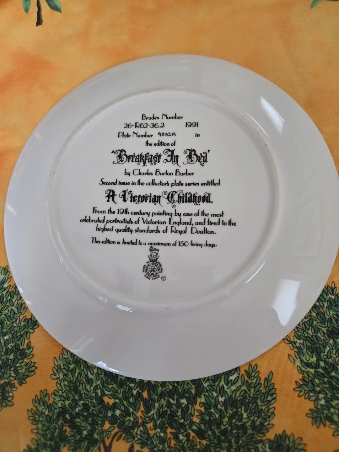 Selling a decorative plate titled "Breakfast In Bed" by Charles Burton Barber. This is the second issue in the collector's plate series, A Victorian Childhood. The plate is from a 19th-century painting of Victorian England and fired to the highest quality standards of Royal Doulton. This edition is limited to a maximum of 150 firing days