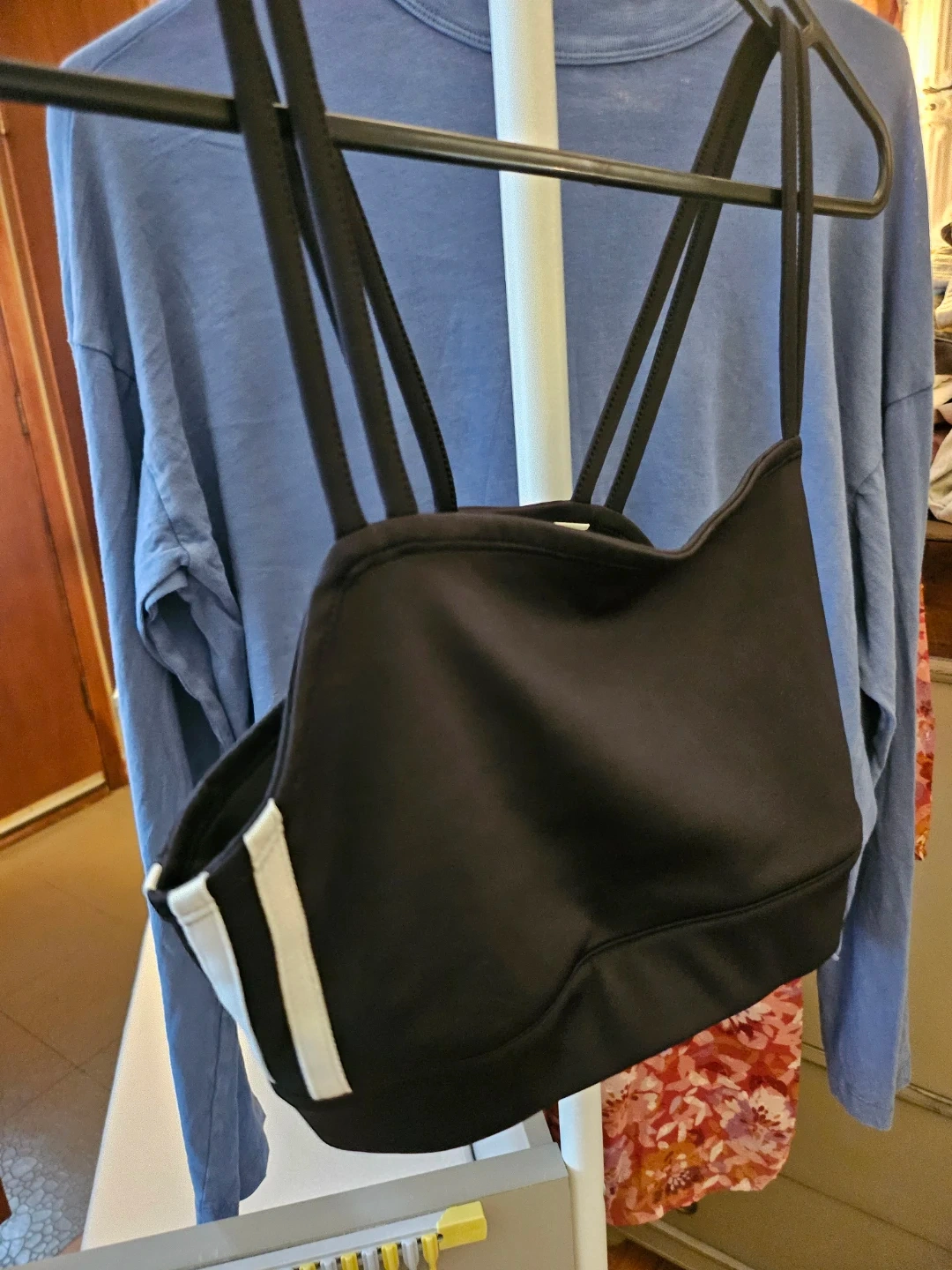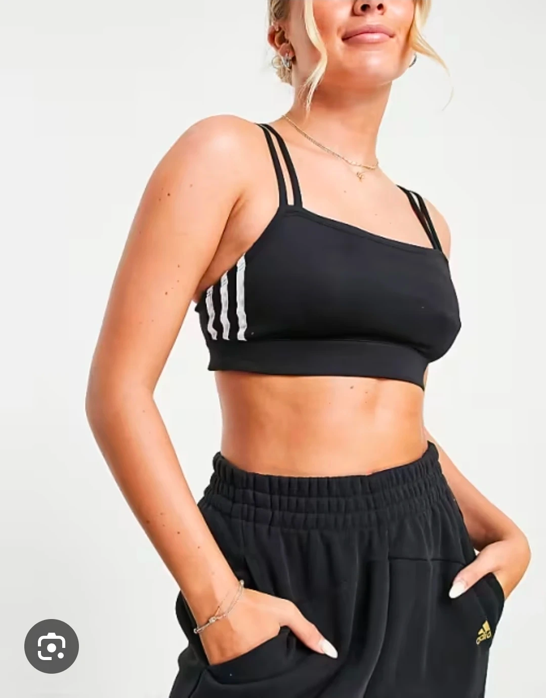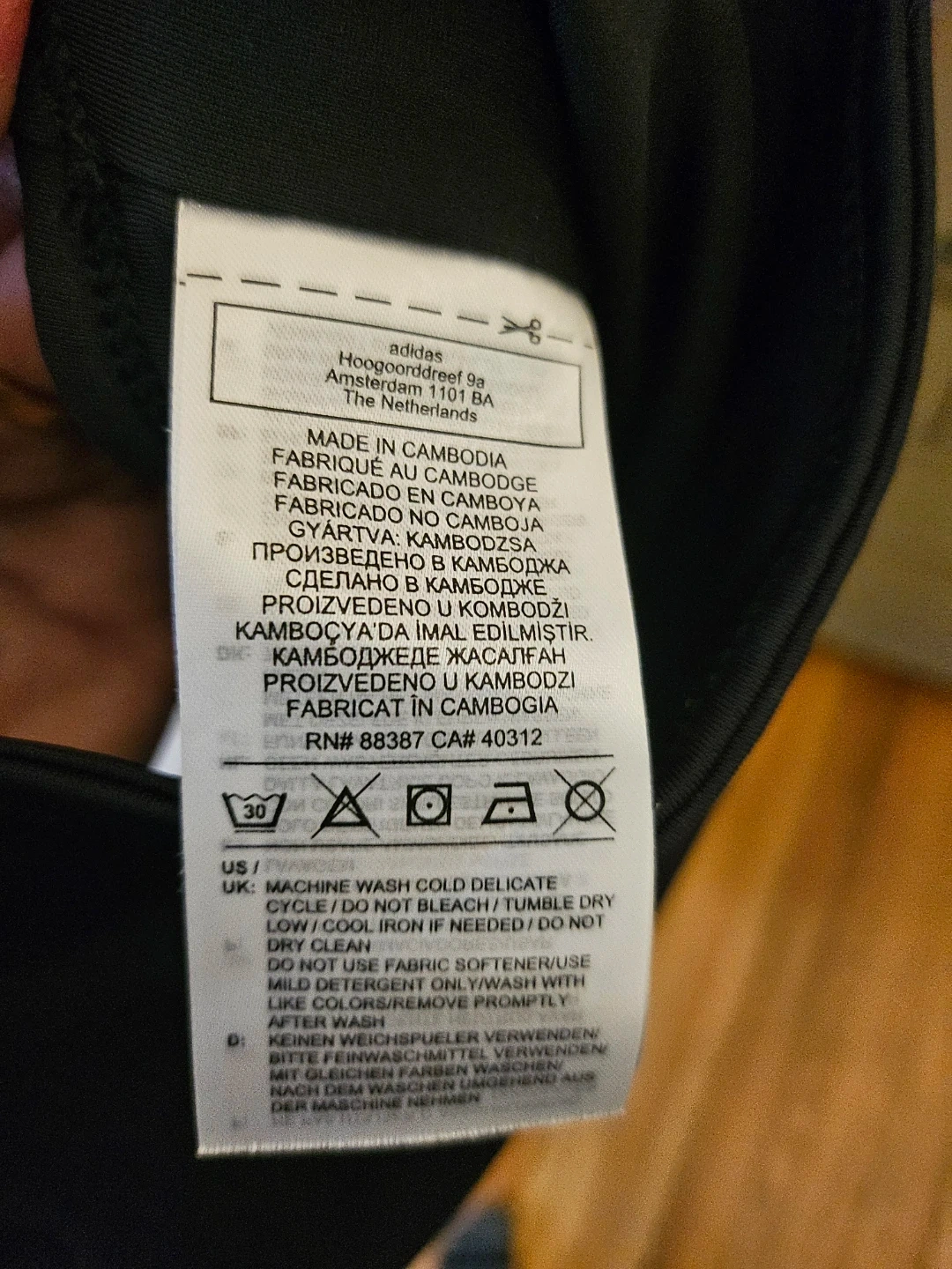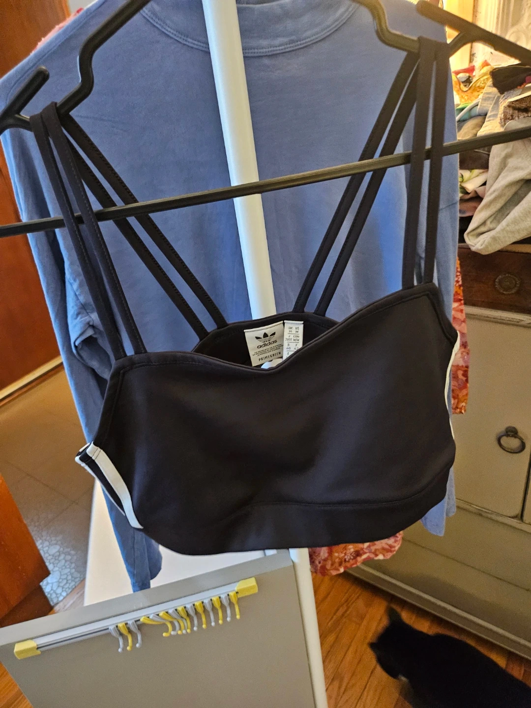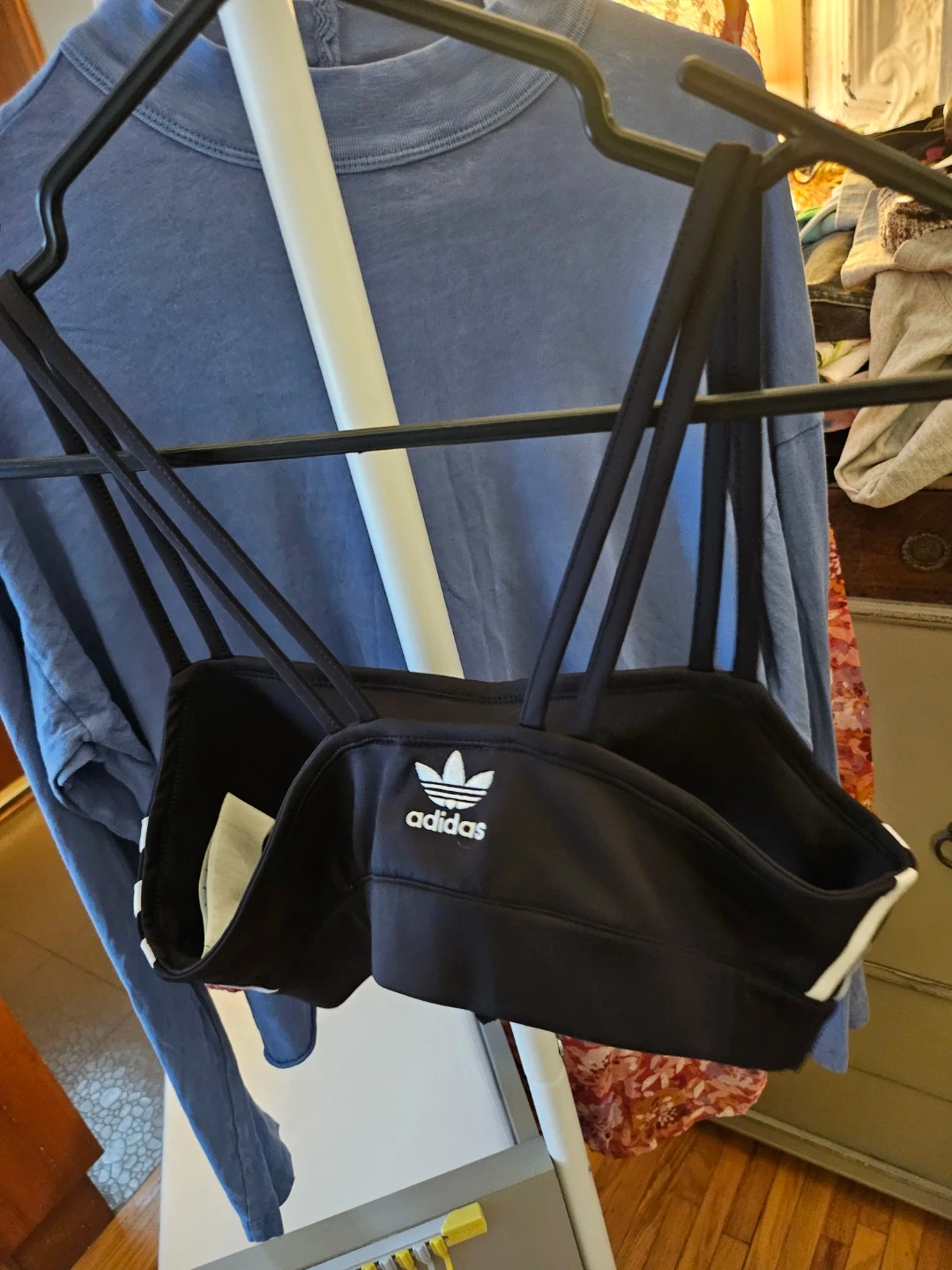Selling an Adidas sports bra in black with white stripes. It's a size M and in great condition! Perfect for workouts or everyday wear. The tag indicates it's made in Cambodia.