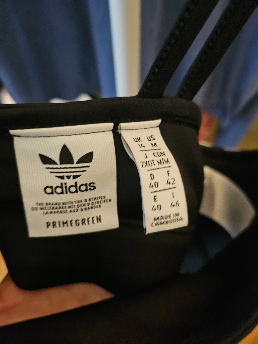 Selling an Adidas sports bra in black with white stripes. It's a size M and in great condition! Perfect for workouts or everyday wear. The tag indicates it's made in Cambodia.