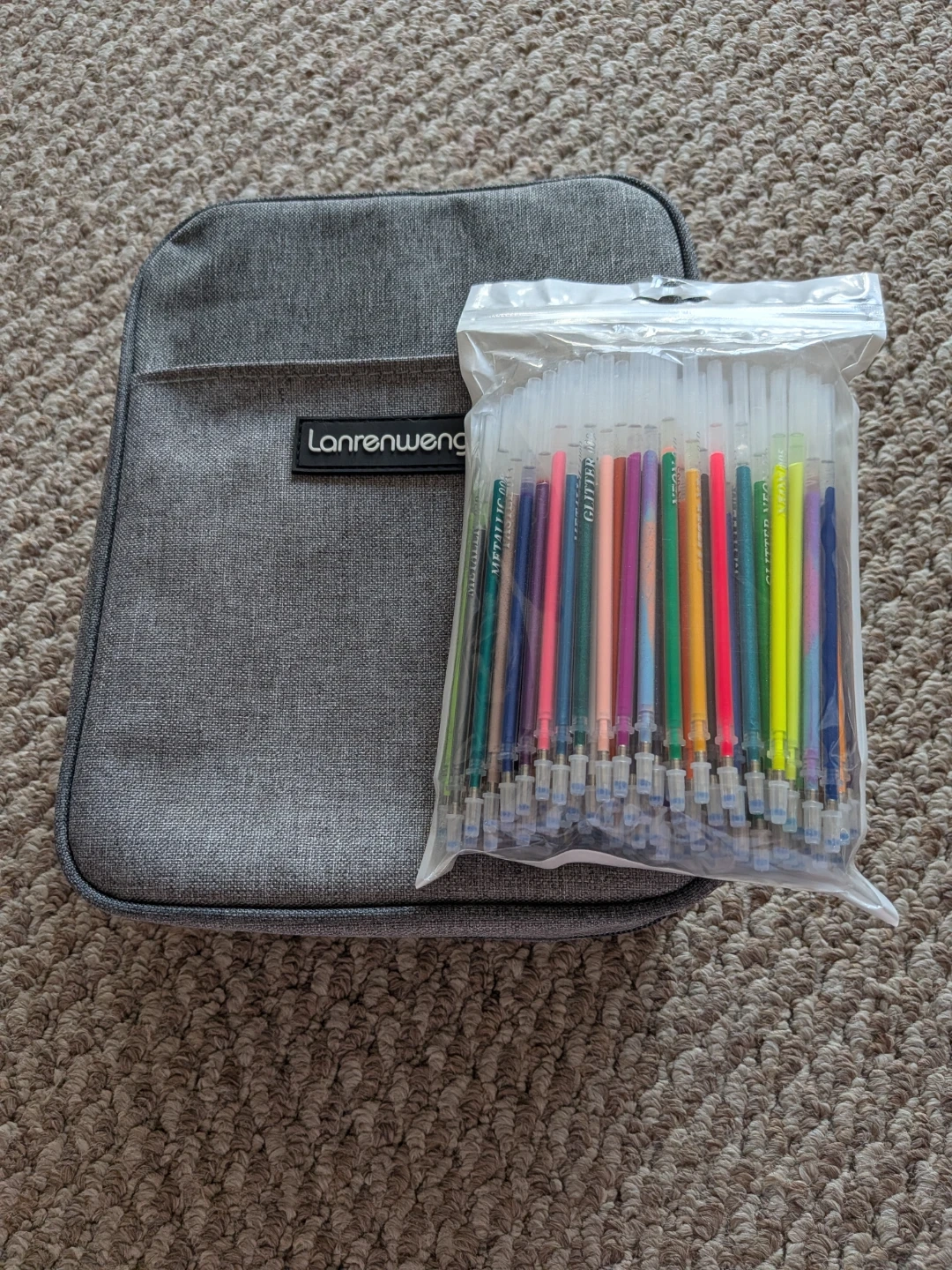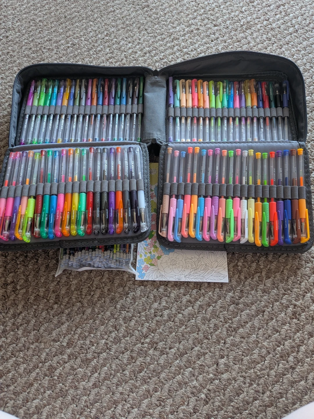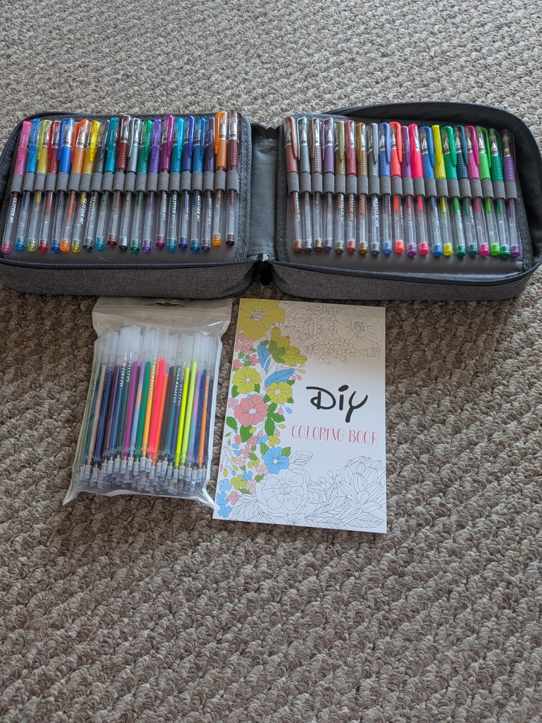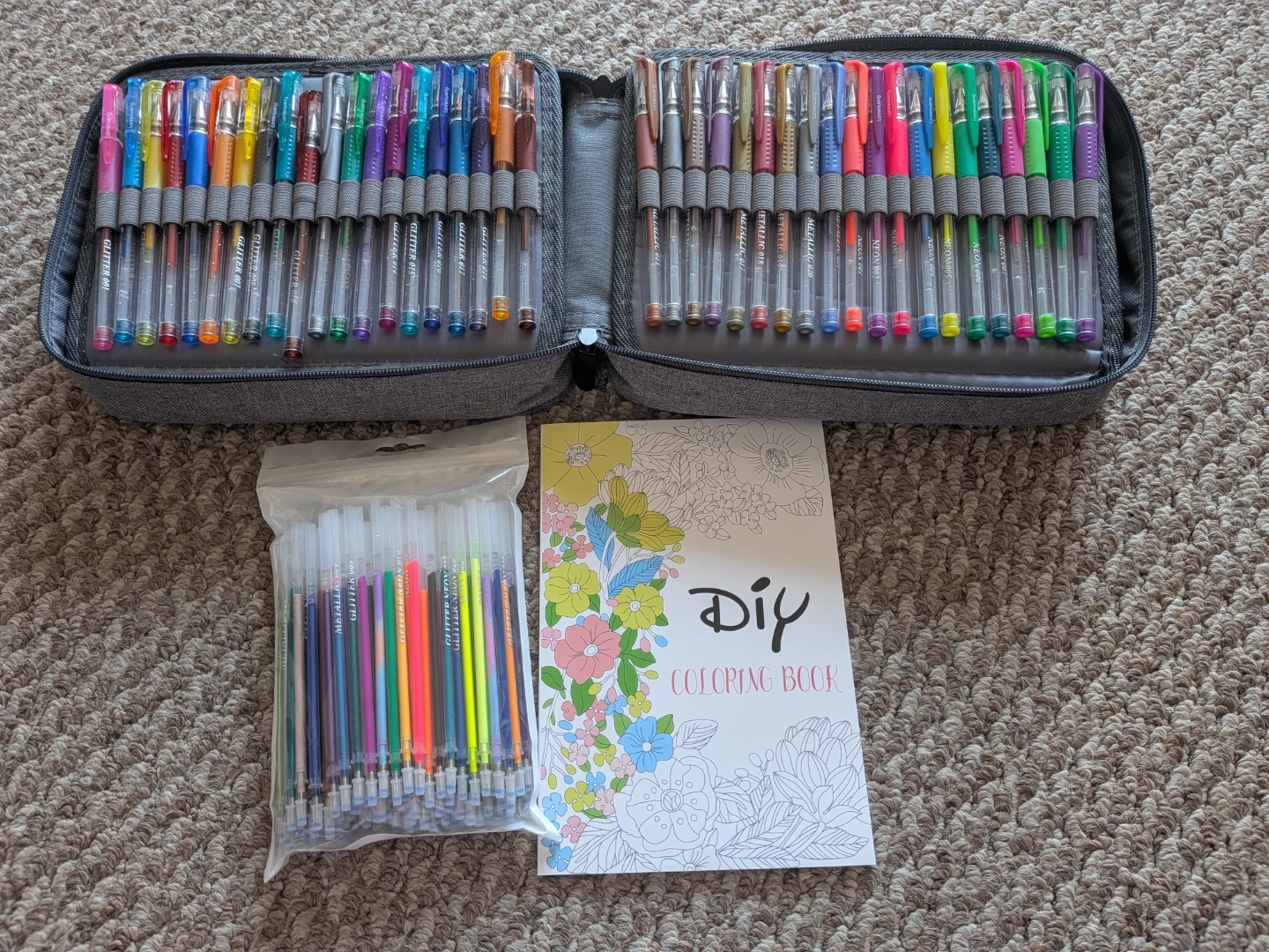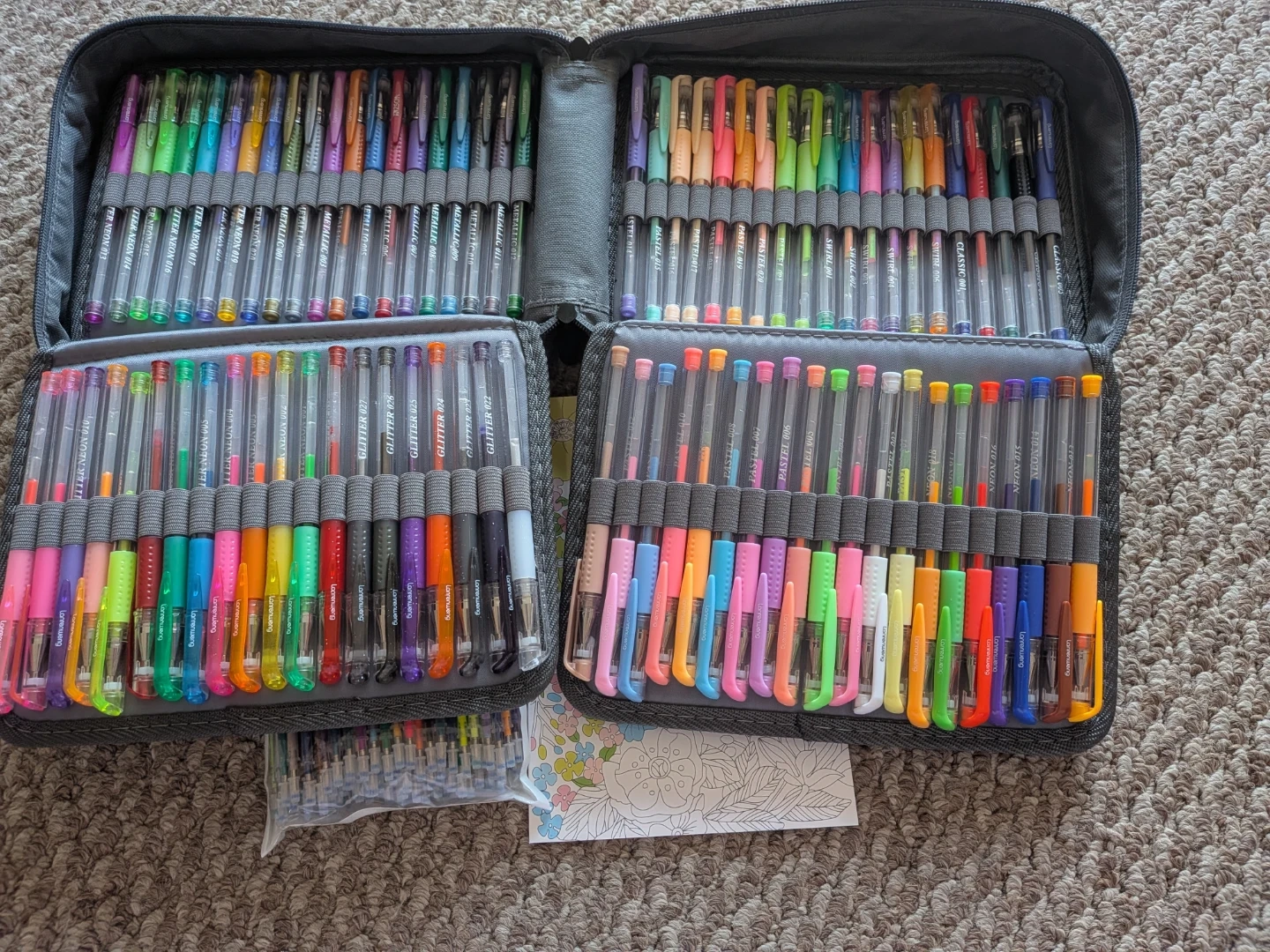 Lanrenweng gel pen set with a case It comes with a DIY colouring book and a bag of extra gel pens. Great for artists and anyone who enjoys colouring