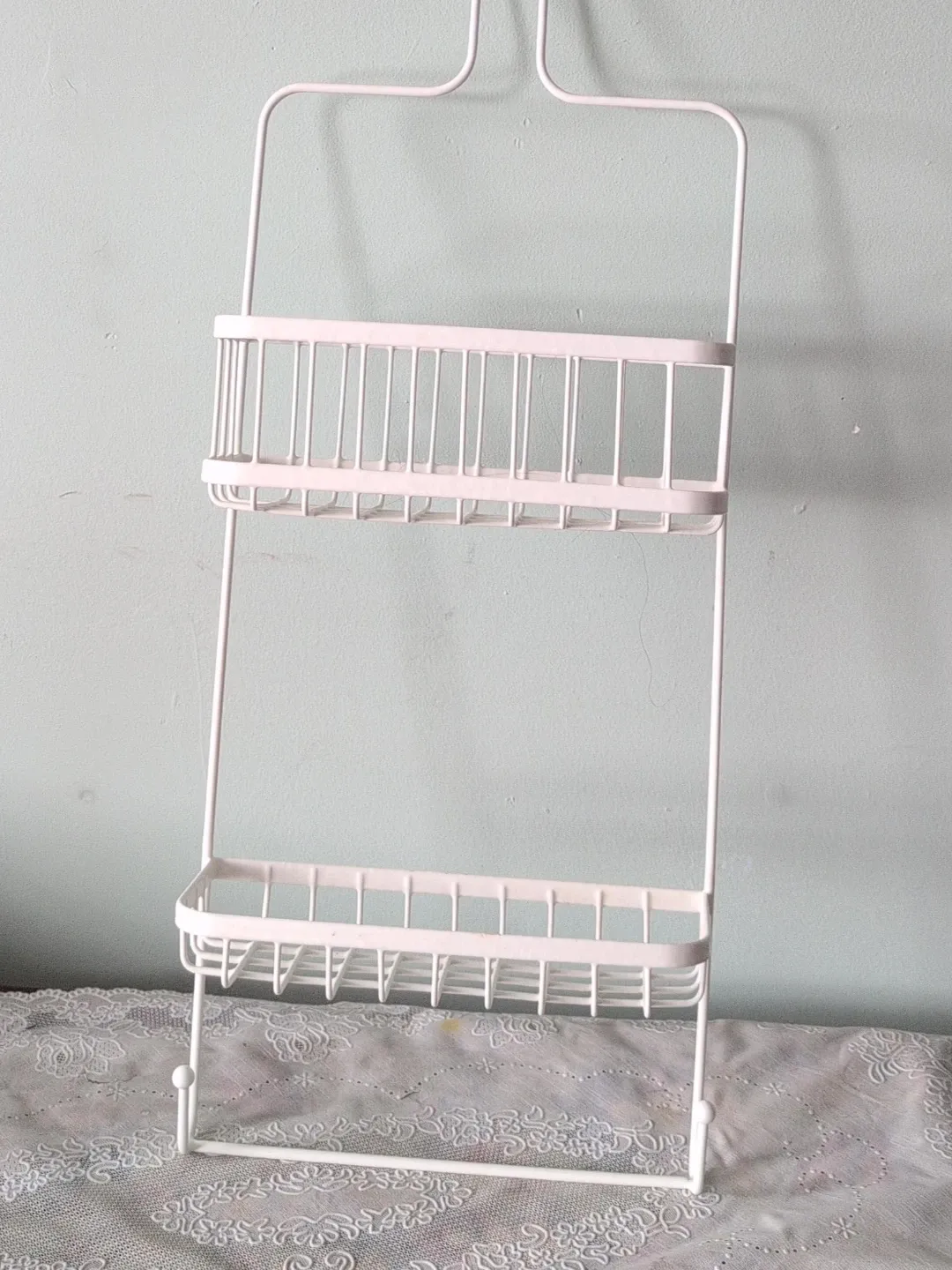 This is a white over-the-door hanging organizer. It's perfect for adding extra storage in your bathroom or closet. It features two shelves and hooks for hanging items.