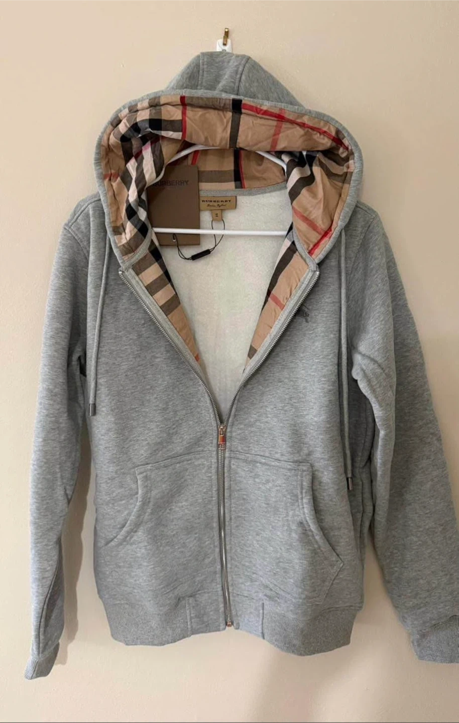 Selling a Burberry grey hoodie. The inside of the hood has the classic Burberry plaid design. It's in great condition and ready for a new home!