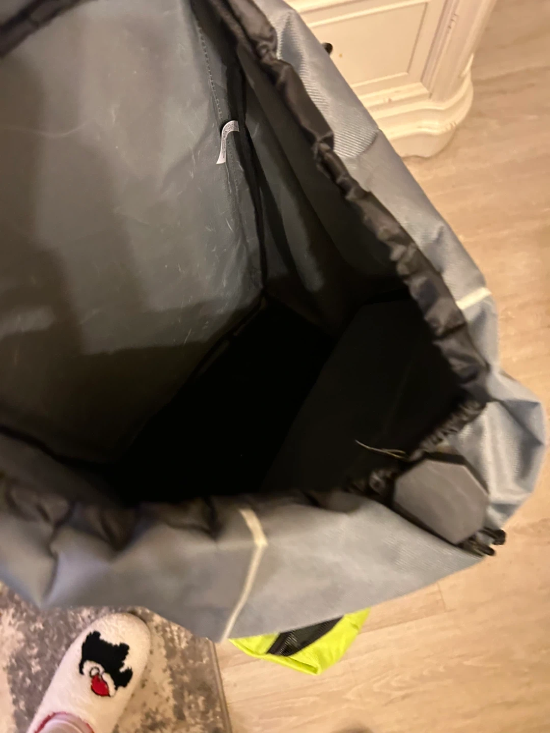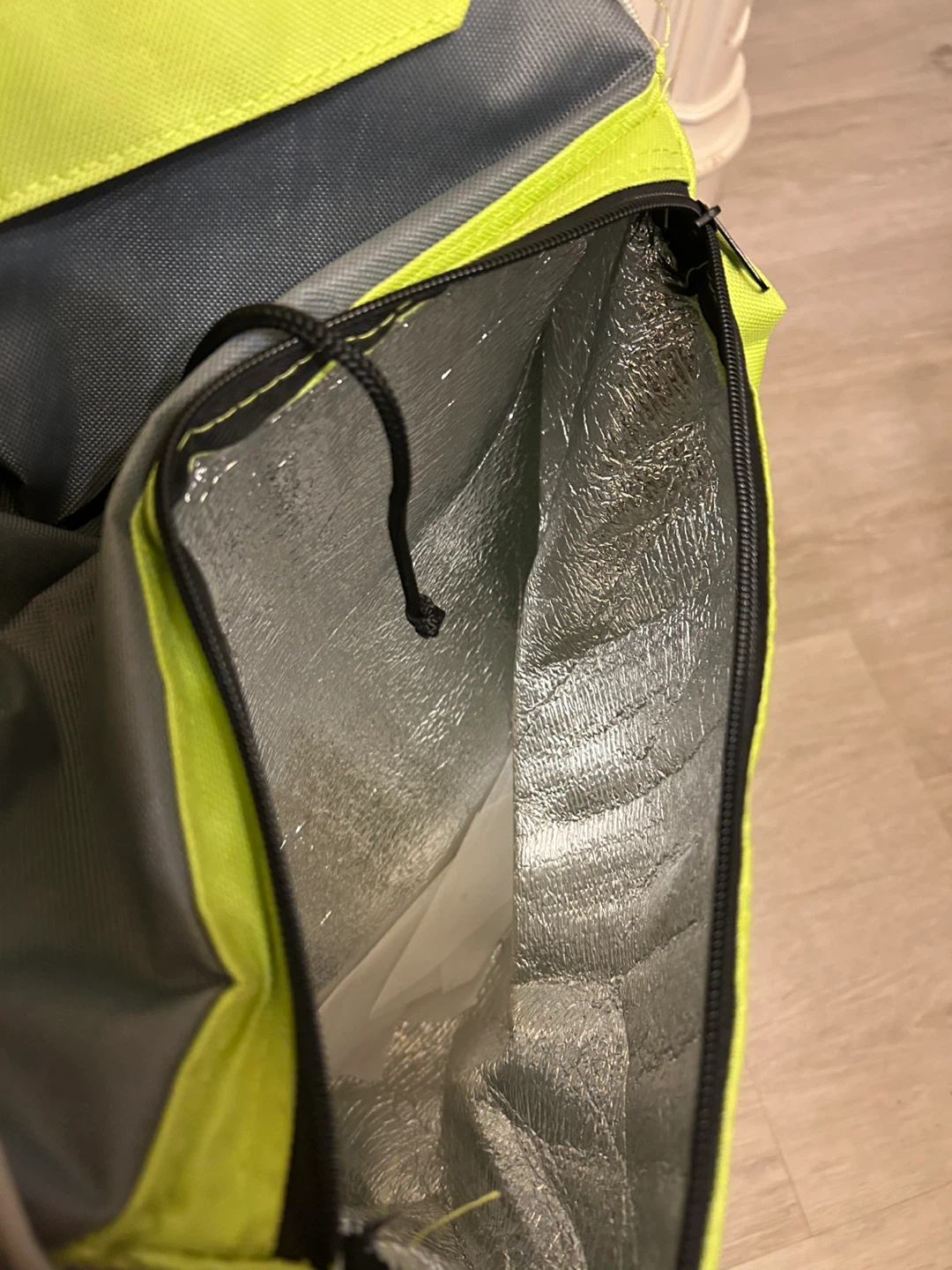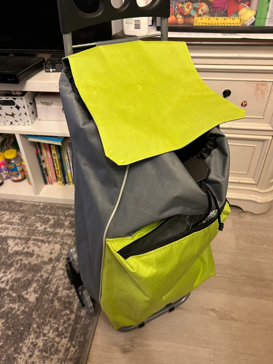 Here's a handy rolling shopping cart! It features a vibrant green and grey colour scheme. The interior looks to be insulated, perfect for keeping groceries cool on the way home. Easy to manoeuvre and great for trips to the market!