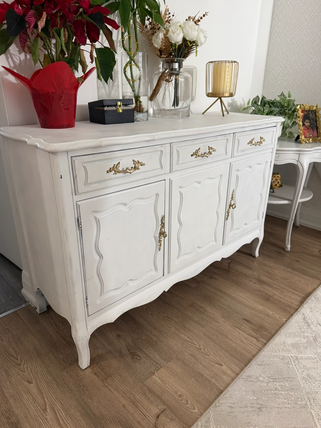 Selling a charming sideboard with a lovely antique-style design! It features ornate gold-tone handles and a classic white finish. It has some wear and tear.
