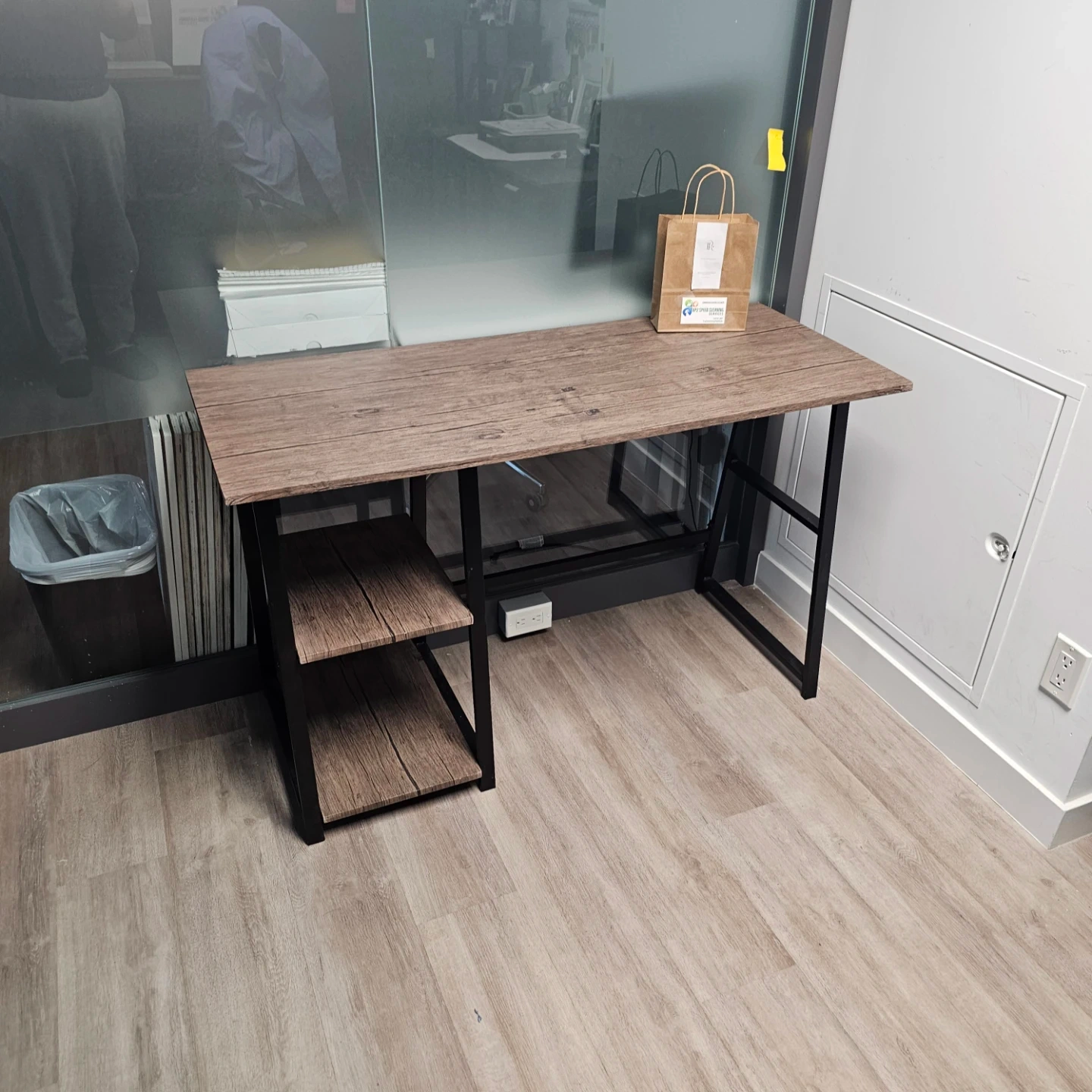 Selling a desk with a wood-look top and black metal frame. It includes two shelves on one side for extra storage. Great for a home office or study space!
