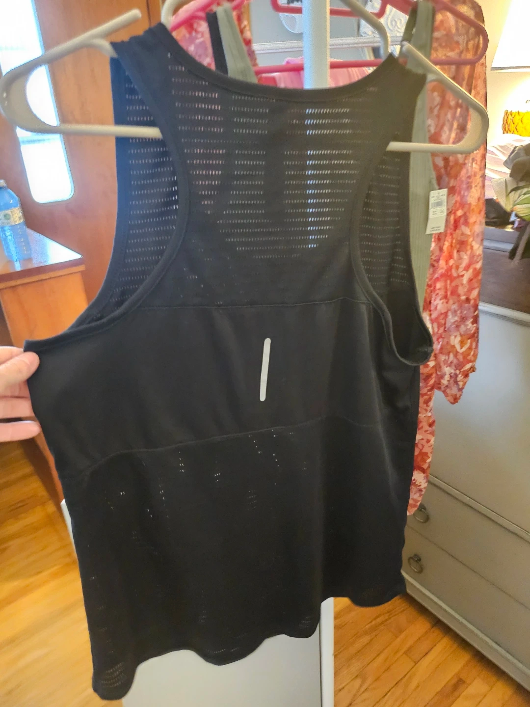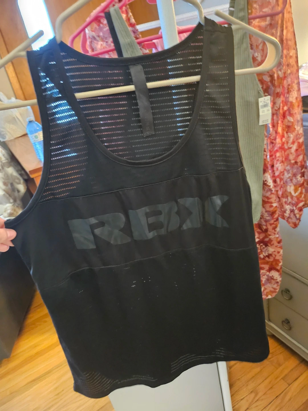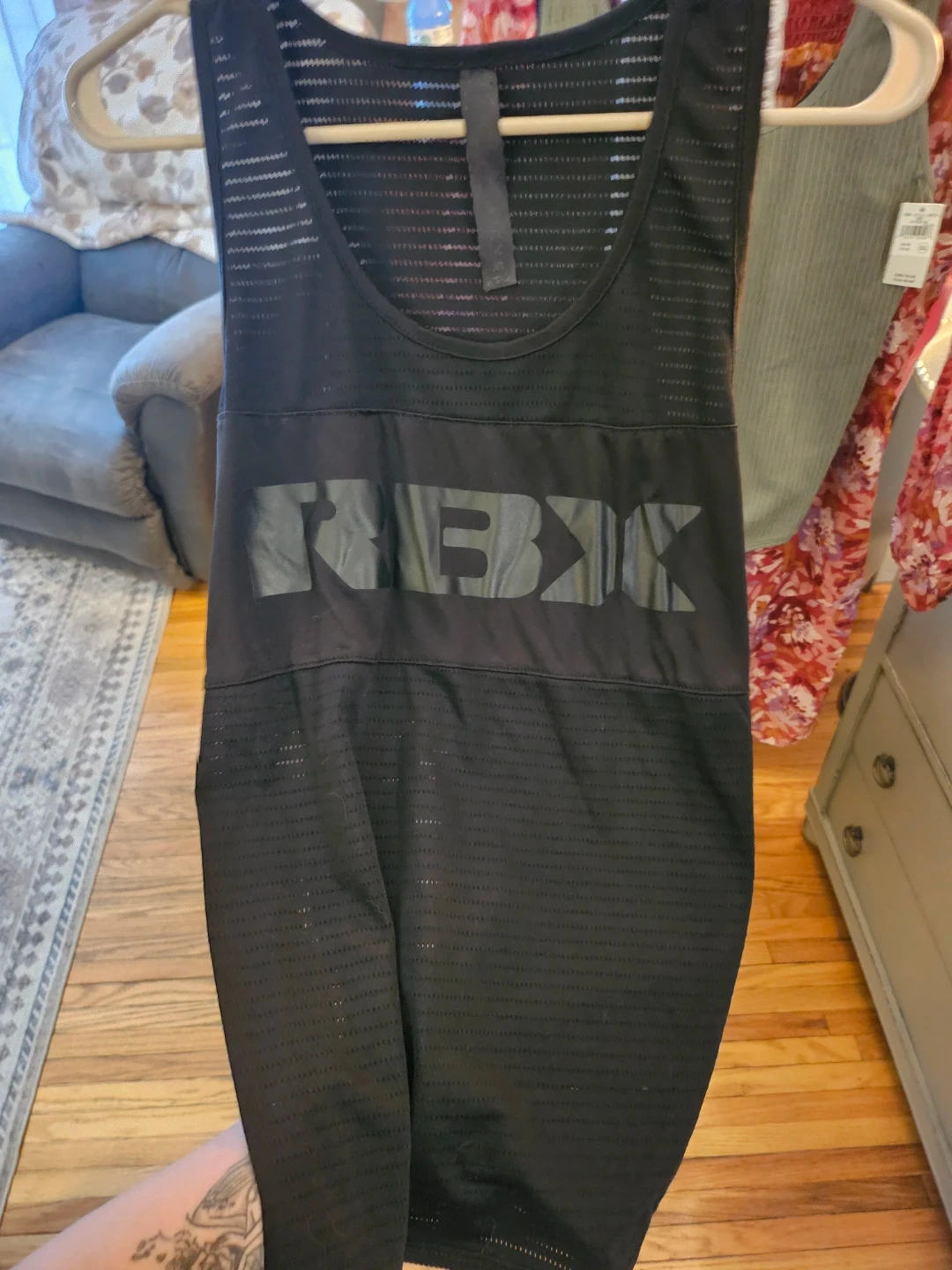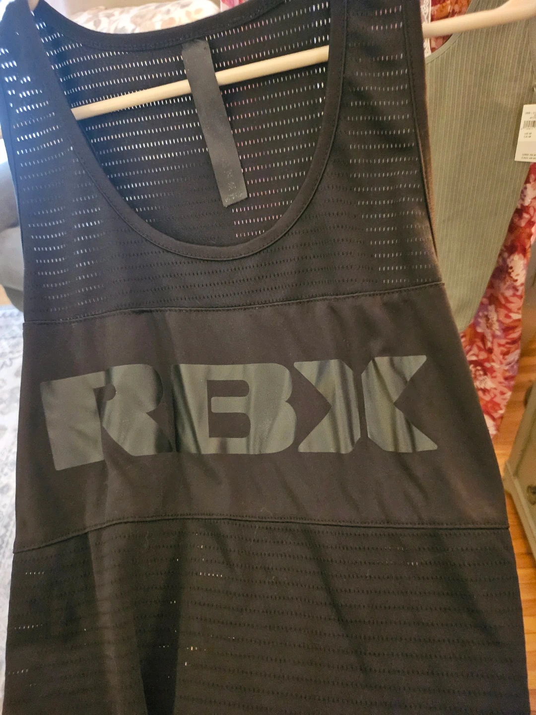 Selling a black athletic tank top from RBX. It features a breathable mesh design and is perfect for workouts or casual wear. The tank top is in good condition and ready for a new owner!