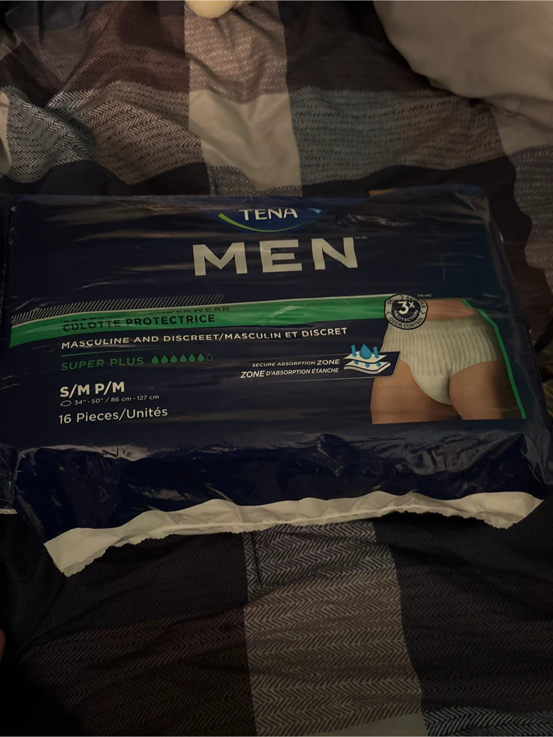 Selling a pack of Tena Men Protective Underwear in size S/M. The package contains 16 pieces. Designed for masculine and discreet protection. The size fits 34"-50" / 86 cm-127 cm and features a secure absorption zone with 3x odour control protection packages opened missing only one father did not like