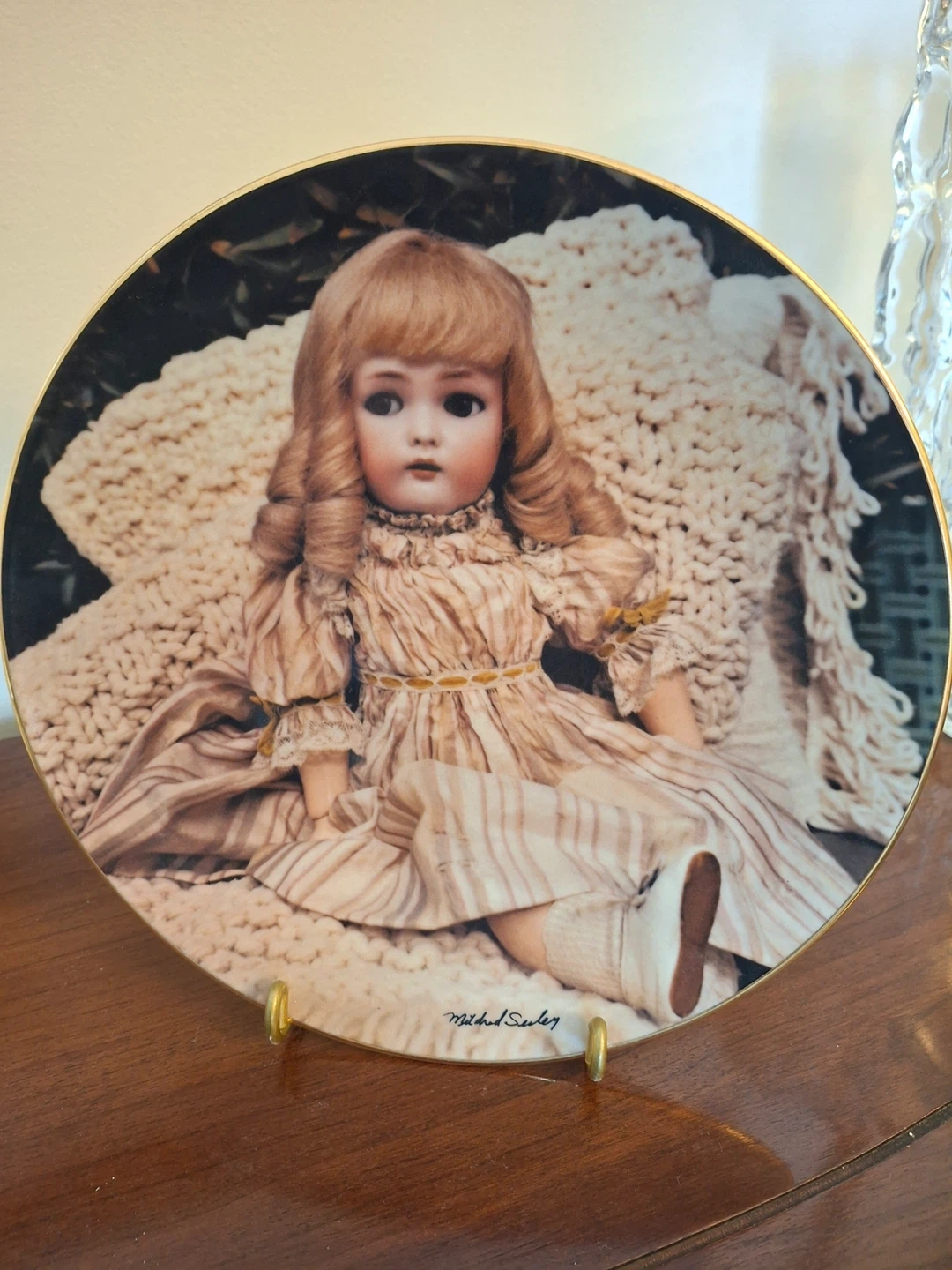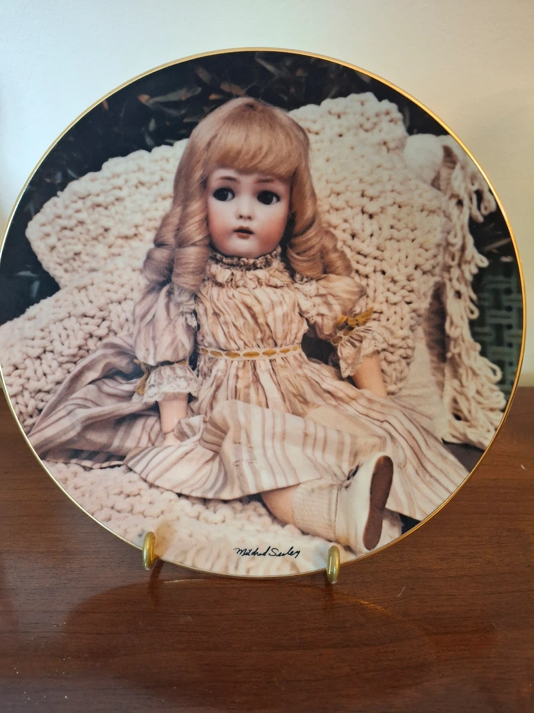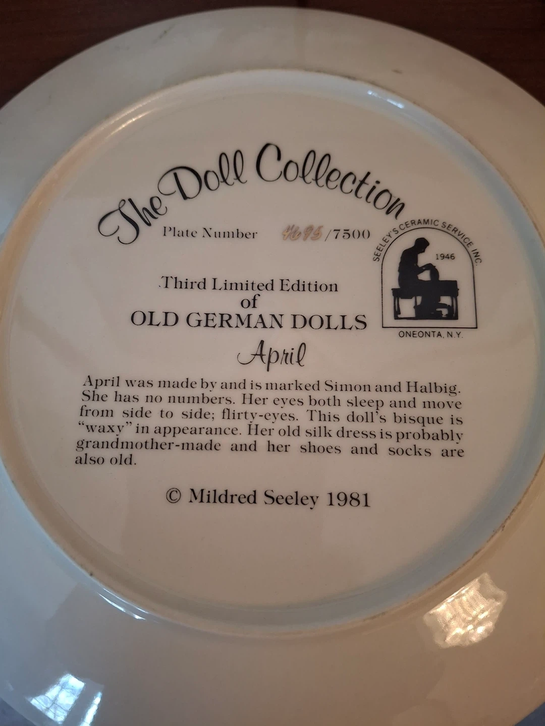 Decorative plate from The Doll Collection, titled "April". It's a third limited edition plate of Old German Dolls. Made by Mildred Seeley, 1981. Stand not included. Available for pickup in Markland Wood.