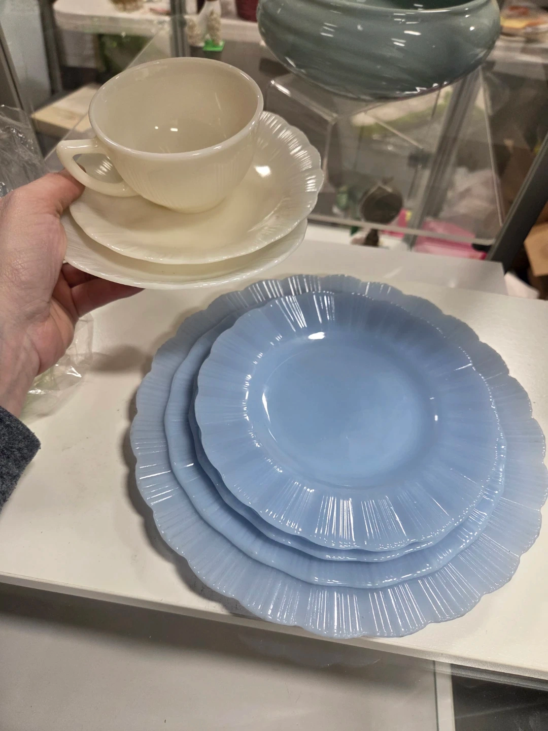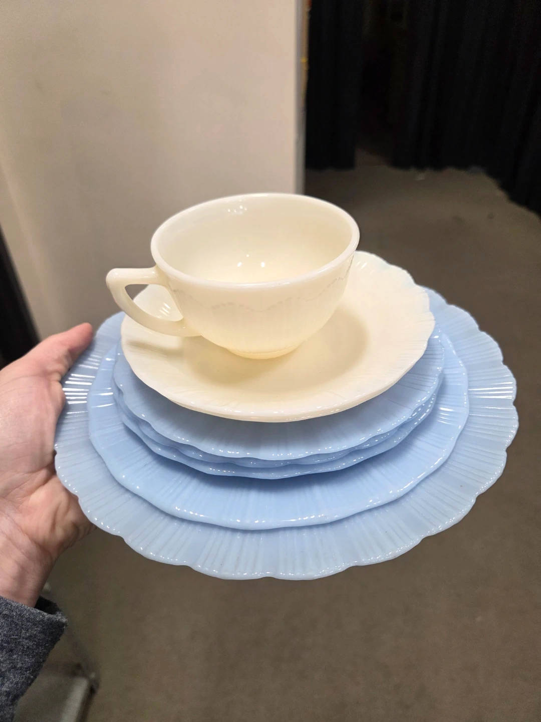 Selling a set of vintage Pyrex plates and a cup. The plates are a lovely light blue colour, and the cup is a creamy white. They're in great shape and would make a charming addition to any kitchen or collection! Made in Canada.