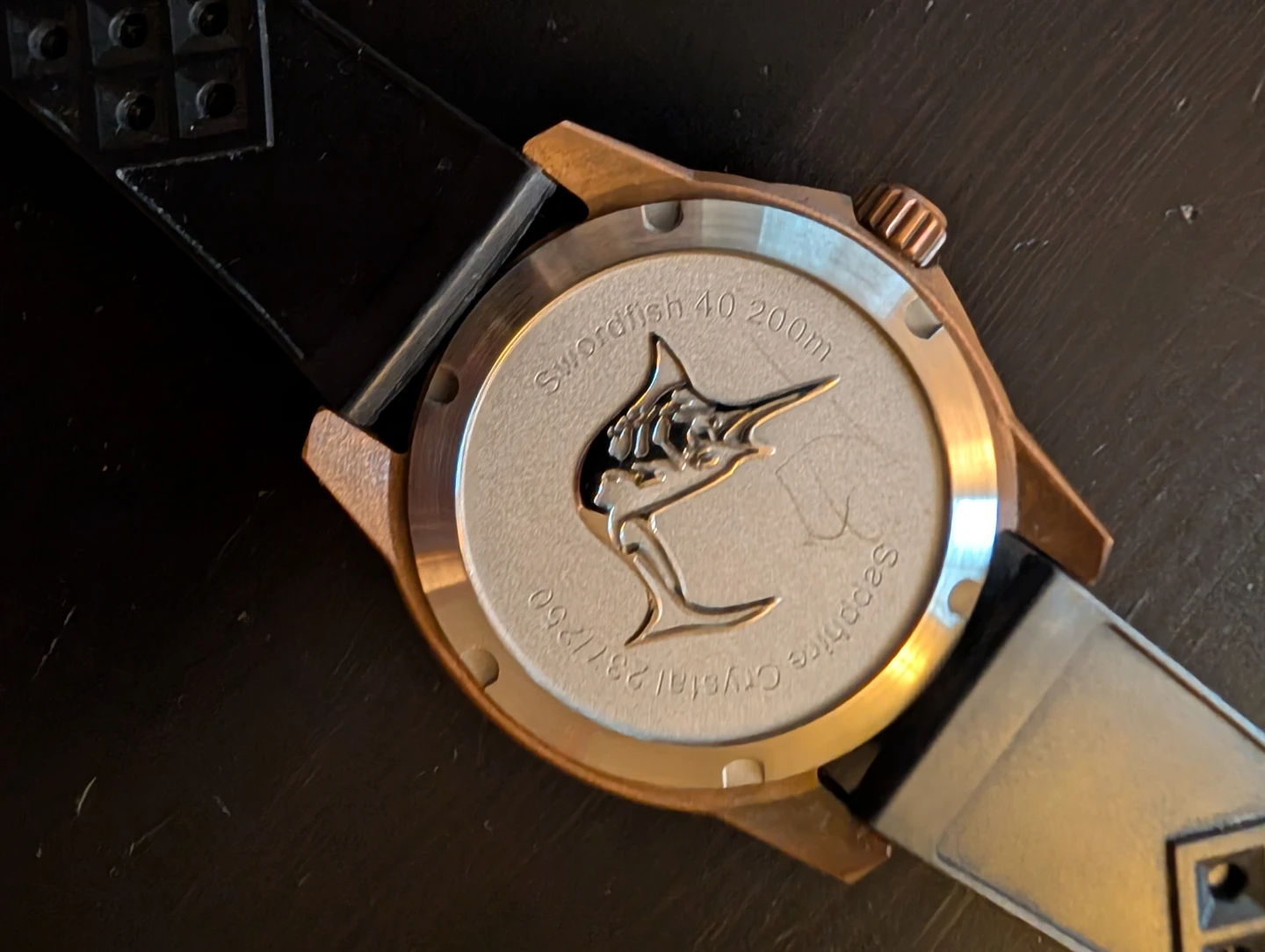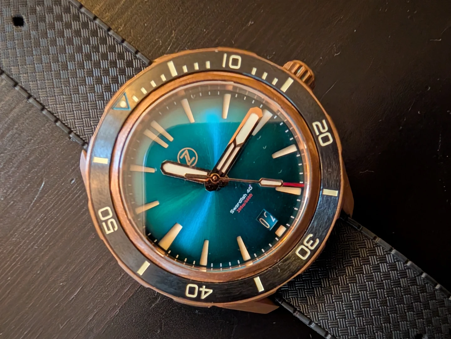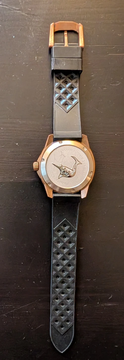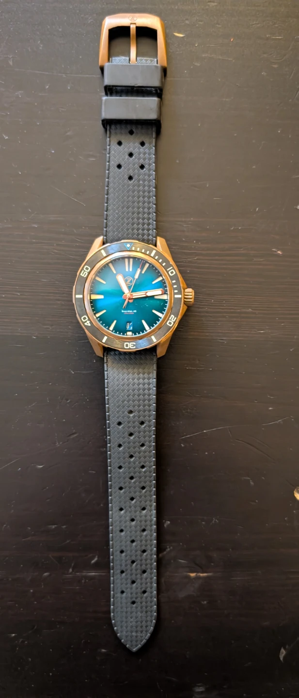 Selling a Zelos swordfish 40 watch! It features a bronze case and a striking blue dial. The watch is in great condition and ready for a new wrist!