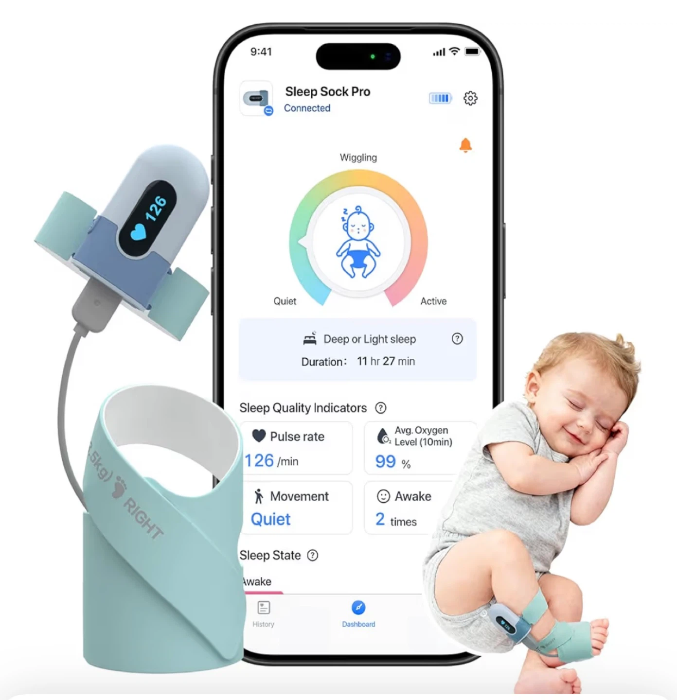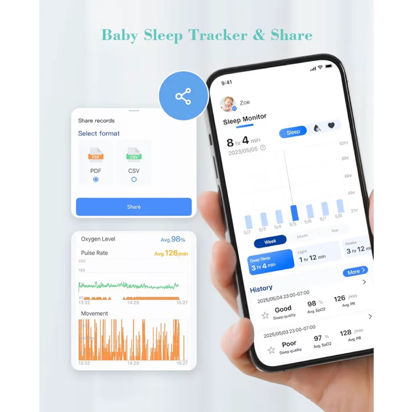 I'm selling a Sleep Sock Pro baby sleep tracker. It tracks pulse rate, oxygen level, and movement. It also monitors sleep state and duration. The app allows you to share records and view sleep quality indicators. It's a great way to keep an eye on your little one's sleep!