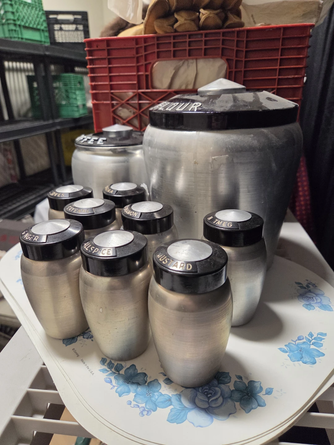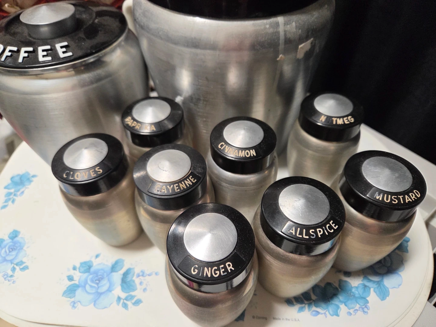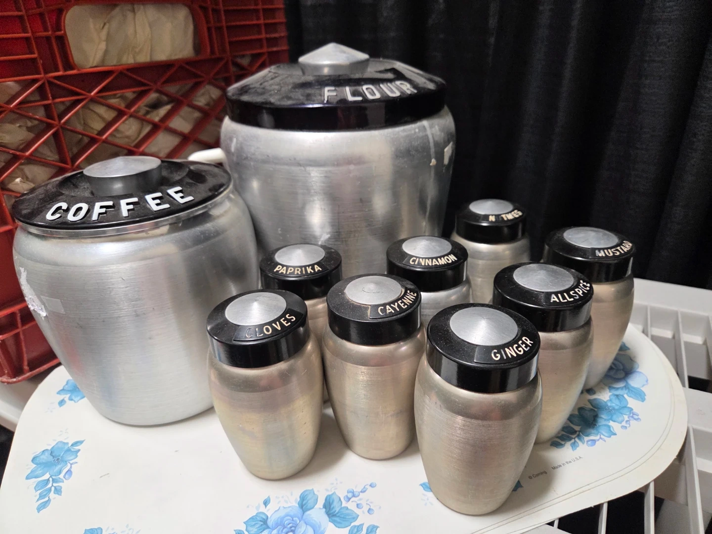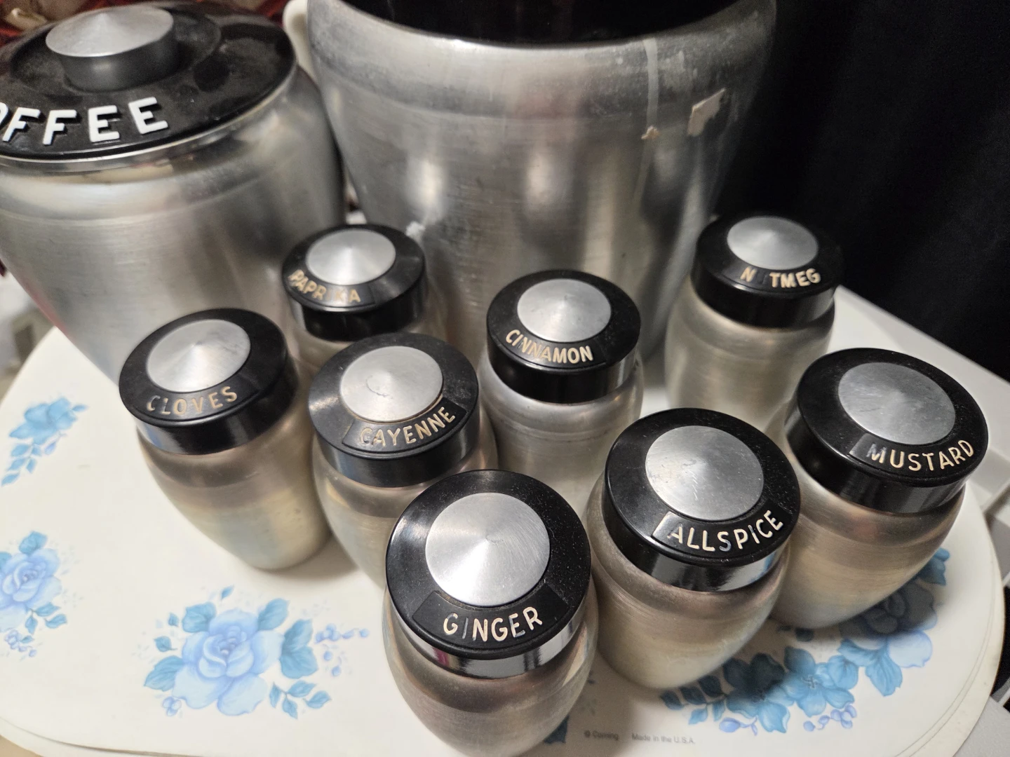 Selling a vintage aluminum kitchen canister set. Includes canisters for flour, coffee, and tea various spices like ginger, allspice, cinnamon, and more! Great for adding a retro touch to your kitchen.