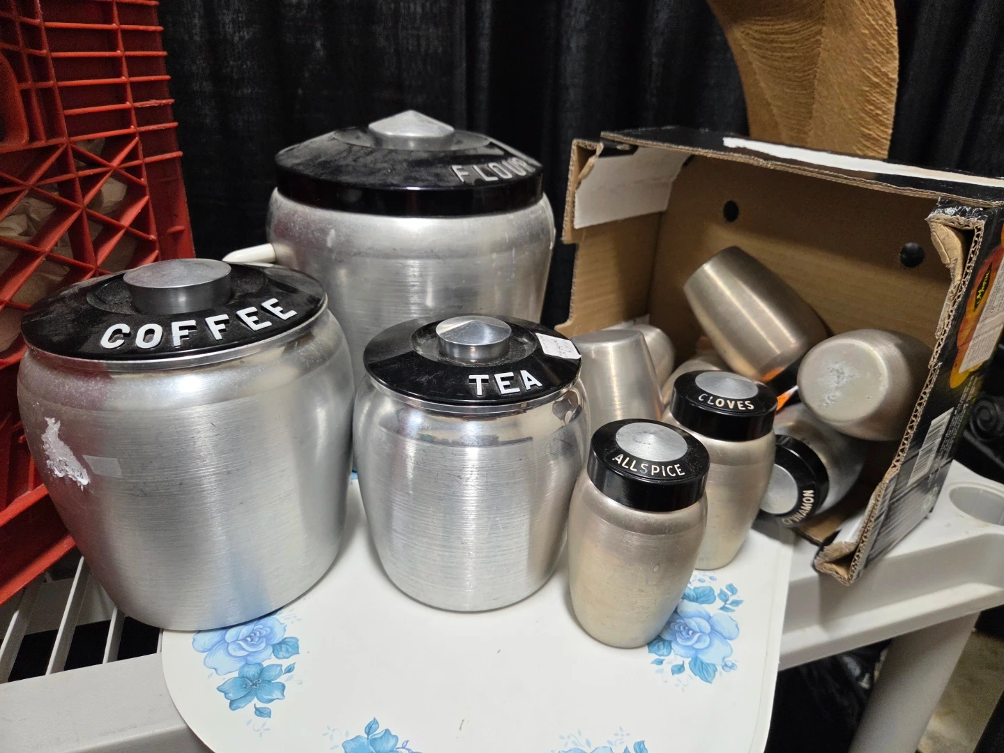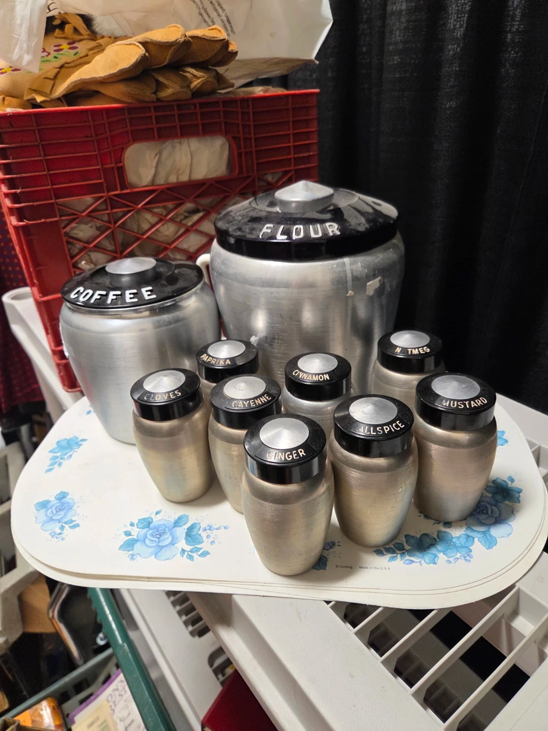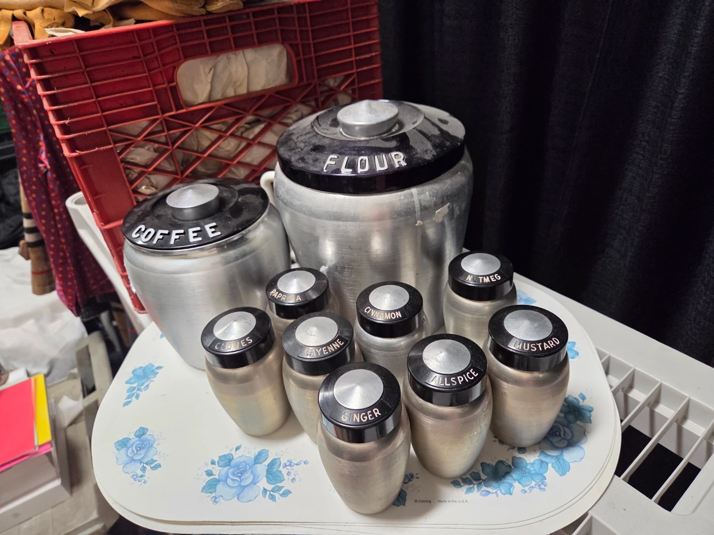 Selling a vintage aluminum kitchen canister set. Includes canisters for flour, coffee, and tea various spices like ginger, allspice, cinnamon, and more! Great for adding a retro touch to your kitchen.