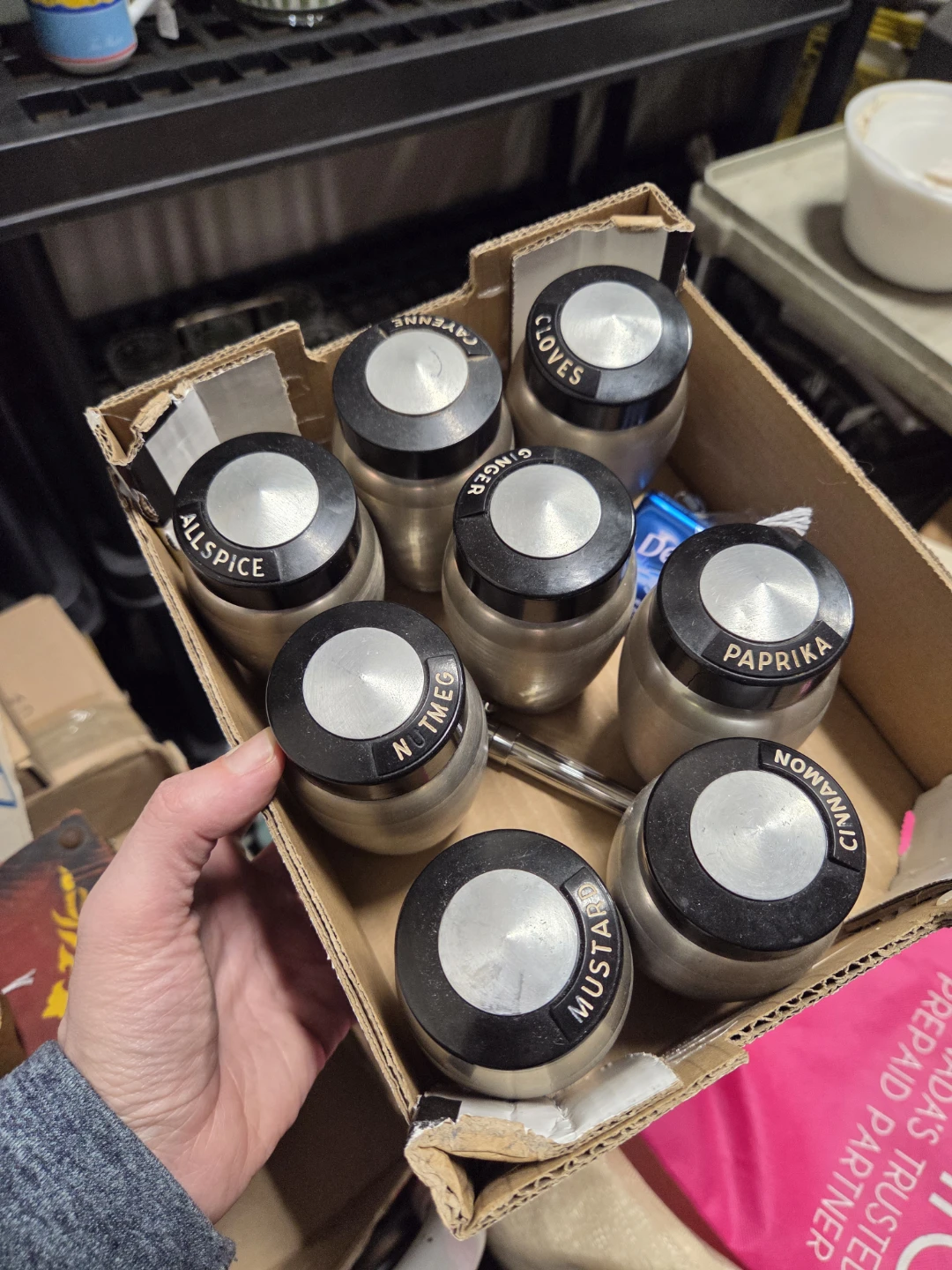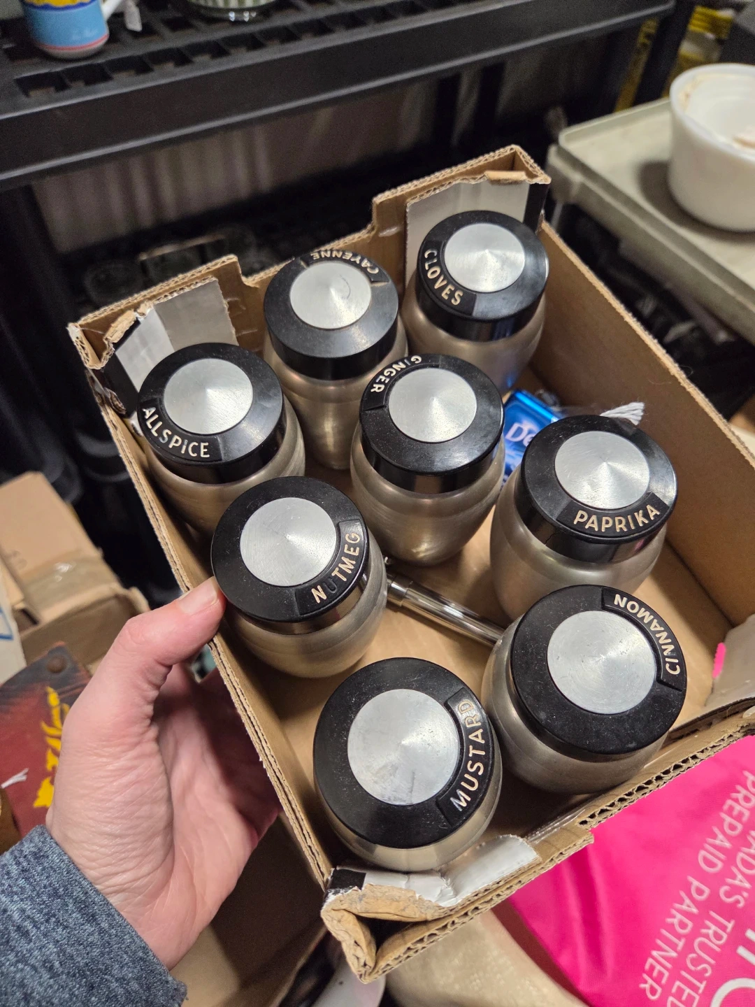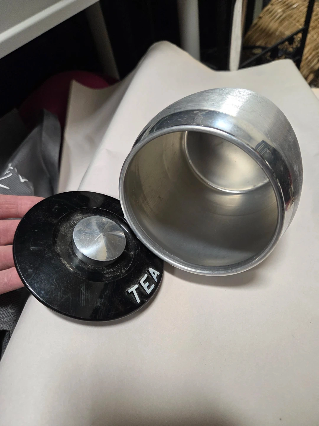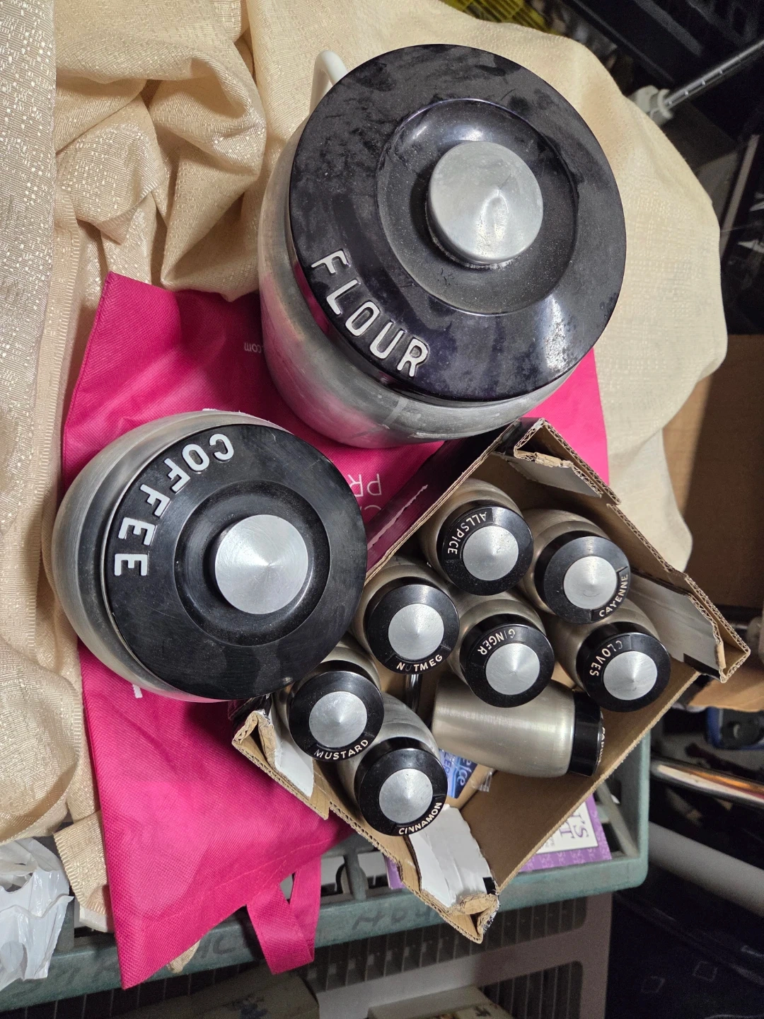 Selling a vintage aluminum kitchen canister set. Includes canisters for flour, coffee, and tea various spices like ginger, allspice, cinnamon, and more! Great for adding a retro touch to your kitchen.