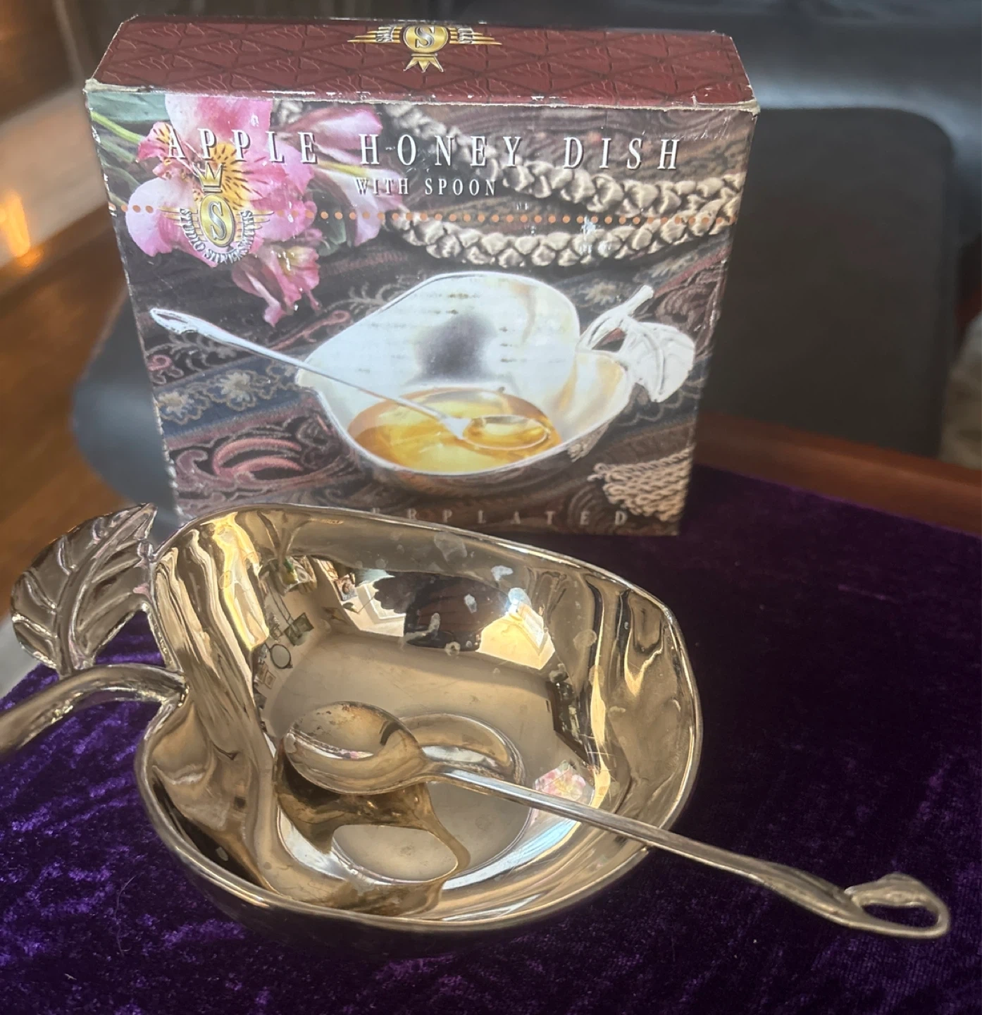 "🧡" Selling a Studio Silversmiths apple-shaped honey dish with a spoon. It's silver plated and comes with the original box