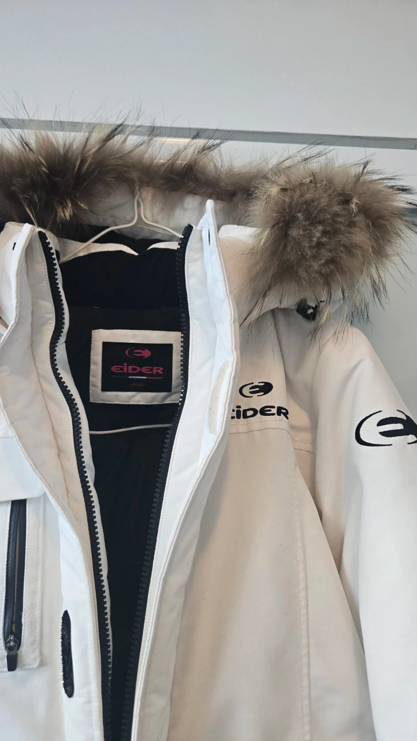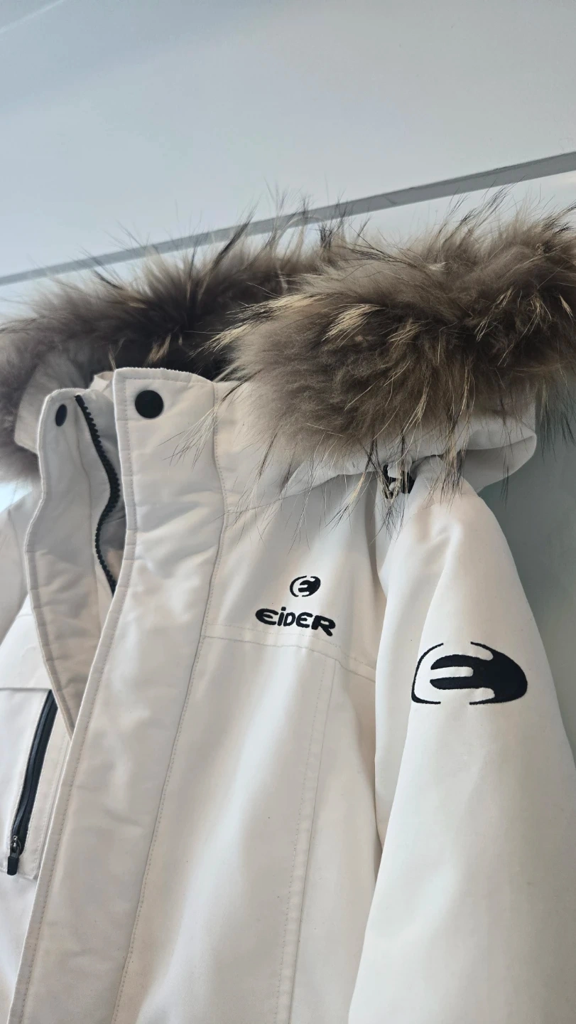Selling a white down jacket from Eider! It has a furry hood and several pockets. The jacket is marked with '700', indicating the fill power of the down. Great for staying warm this winter!