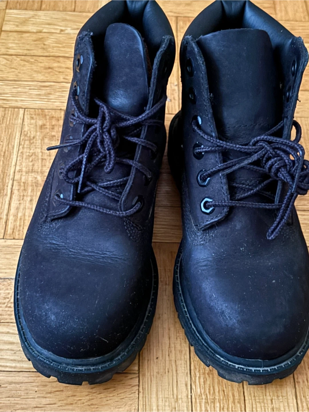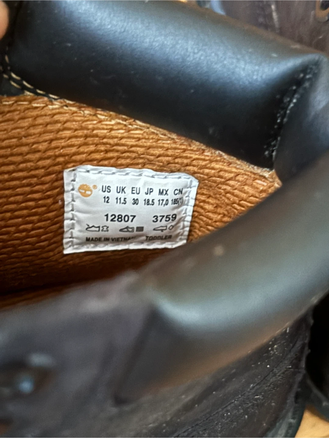 These are a pair of Timberland toddler boots in black, size 12 US. They show some signs of wear but are still in good condition for your little one to explore in!