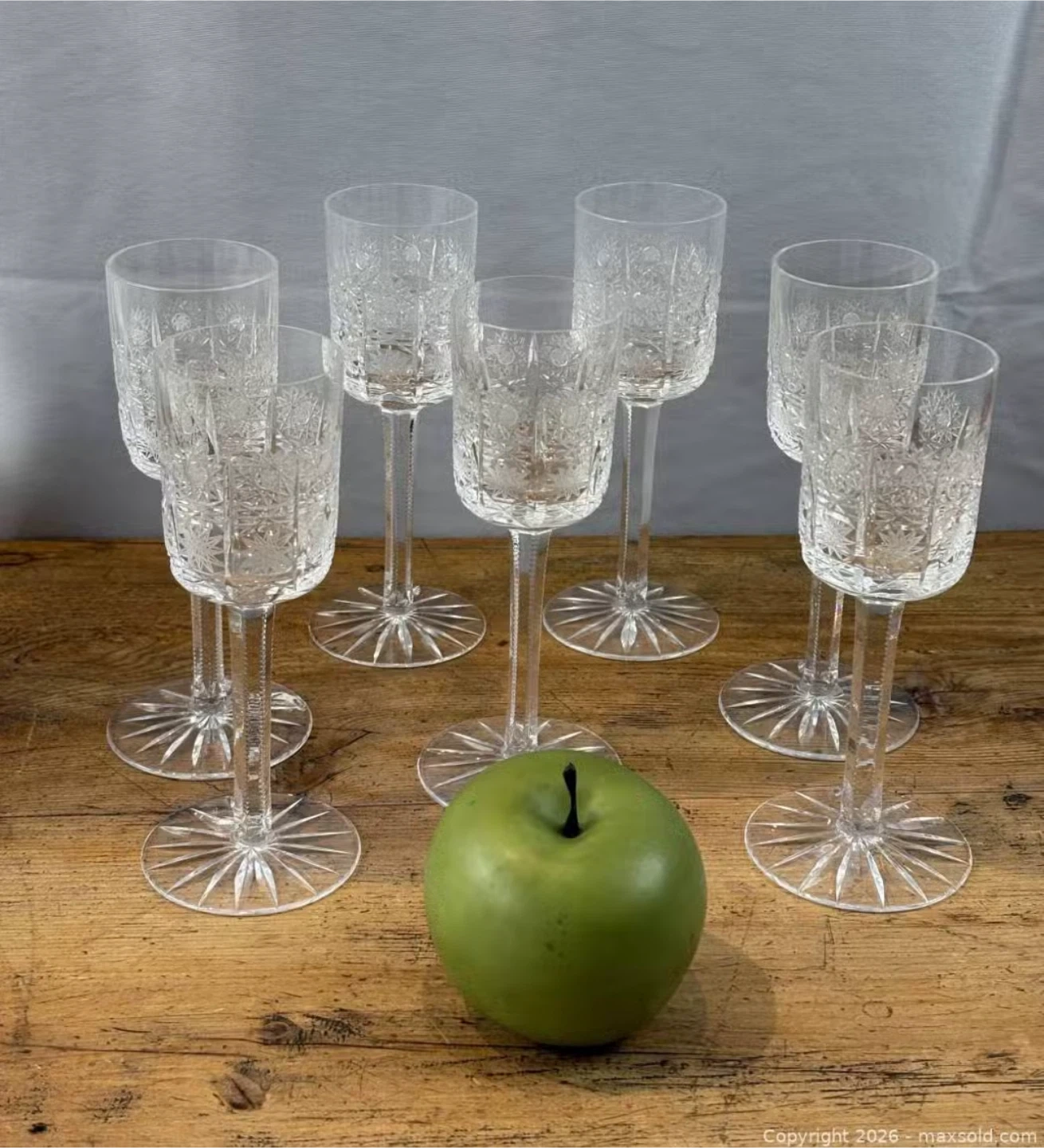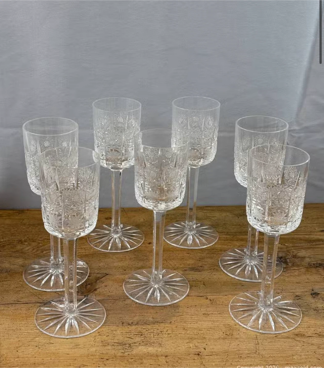 Selling a set of 7 vintage crystal cordial glasses. These glasses feature a beautiful starburst pattern and are perfect for serving liqueurs or small cocktails. They add a touch of elegance to any occasion!