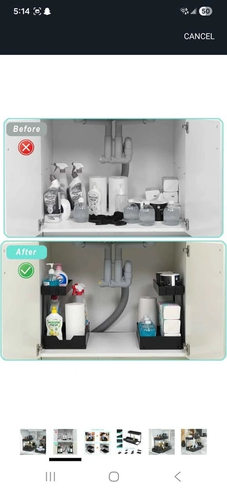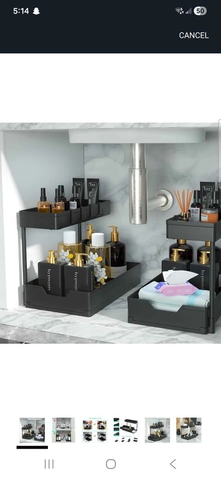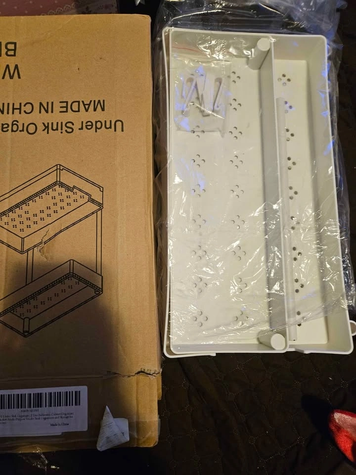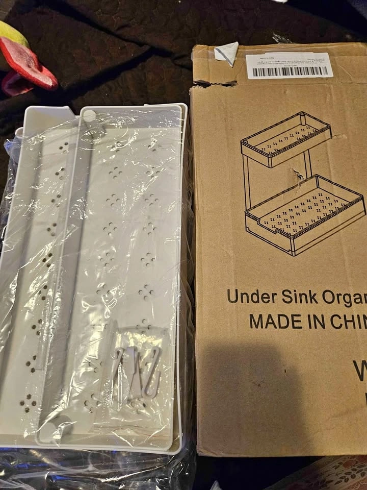 I have a new, unassembled under-sink organizer for sale, perfect for maximizing space in your bathroom or kitchen! This handy two-tier sliding storage shelf is designed to fit neatly under the sink and keep your cleaning supplies or toiletries in order. Never been used, still in its original packaging.