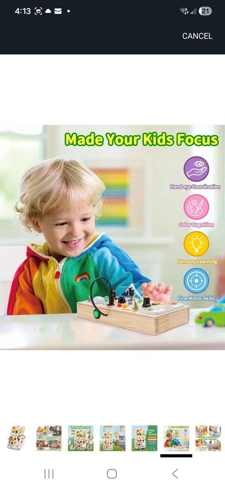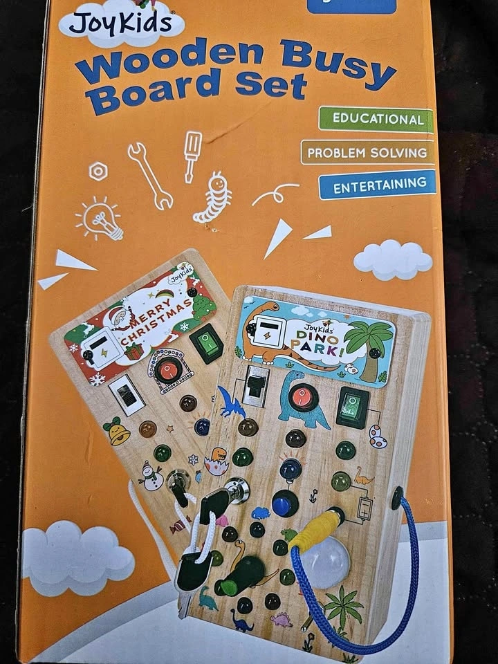 This is a new JoyKids wooden busy board set designed to be educational, problem-solving, and entertaining for toddlers. It features a variety of interactive elements to stimulate sensory learning and fine motor skills. It makes a perfect gift for toddlers.