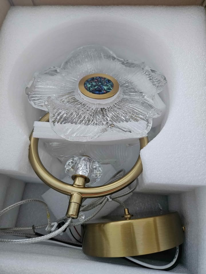 I am offering a brand new flower pendant light that features a petal-textured glass shade and an electroplated brass body for a touch of elegance. This light has never been installed and comes with an adjustable height feature. It's rated for 120V and consumes only 6W with its LED, providing 500lm of brightness at a colour temperature of 6000K. The materials include aluminum, metal, and glass, ensuring durability and a modern look. This would add a touch of modern glamor to any room!