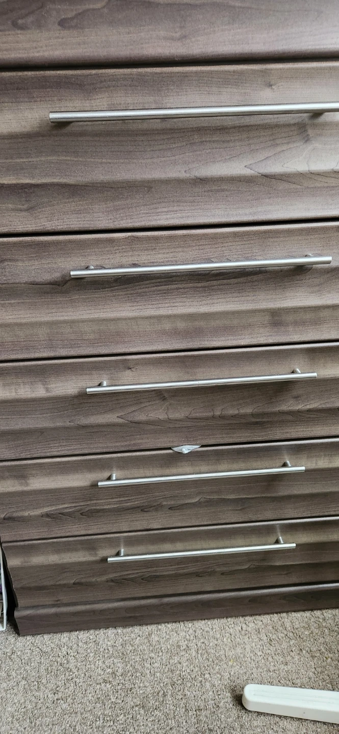 Here's a wood grain dresser with five drawers. There's some visible wear on one of the drawers, as shown in the photos. It's perfect for adding some extra storage to your bedroom or living space